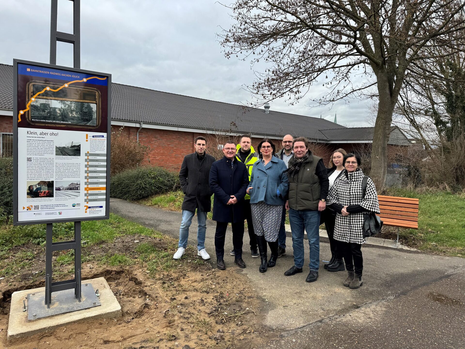 „Unsere Region war und ist im Wandel, das wird an diesem Weg verdeutlicht. Heute nutzen viele Fahrradpendlerinnen und -pendler die Trasse, die wir durch die zusätzliche informative Verbindung der Orte aufwerten. Gleichzeitig wird ein wichtiger Beitrag für klimafreundliche Mobilität geleistet“, sagt Bürgermeister Ralf Claßen. Die beiden im Kreisgebiet installierten Tafeln sind im gleichen Stil wie die Stelen in der Städteregion, um die Verbindung zu unterstreichen.