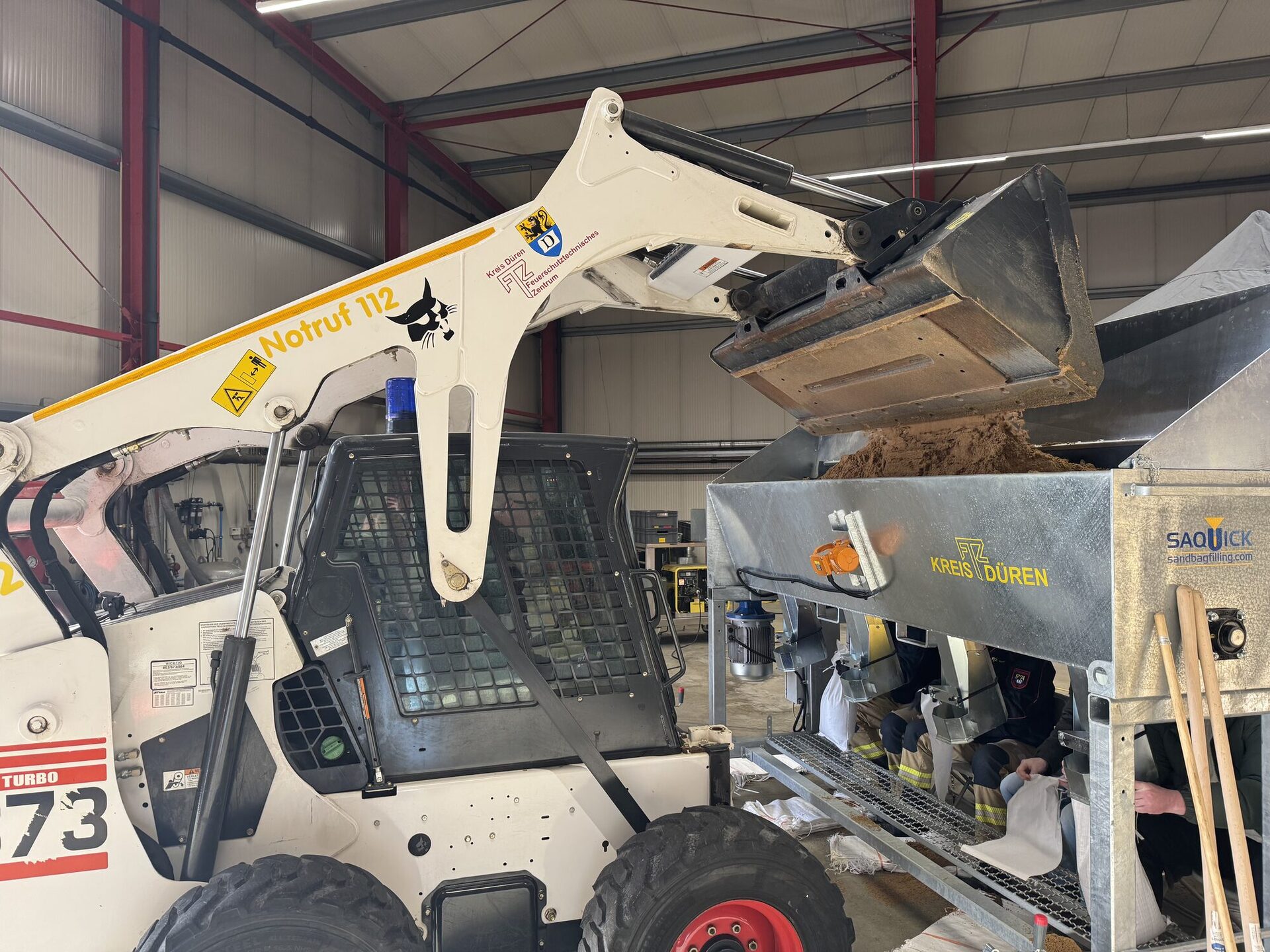 Die Maschine ist mobil und in etwa 30 Minuten aufgebaut, ein Generator versorgt sie mit Strom, damit der Sand rüttelnd verteilt werden kann, die Nähmaschinen zum Verschließen funktionieren und die Einsatzkräfte Licht haben. Zwei Maschinen hat der Kreis am FTZ stehen. Wir sind gut vorbereitet. Die Starkregenereignisse und Einsätze haben in den vergangenen Jahren leider zugenommen, sodass auch die Sandsack-Abfüllmaschine sicherlich in Zukunft häufiger zum Einsatz kommen muss”, sagt Karlheinz Eismar.