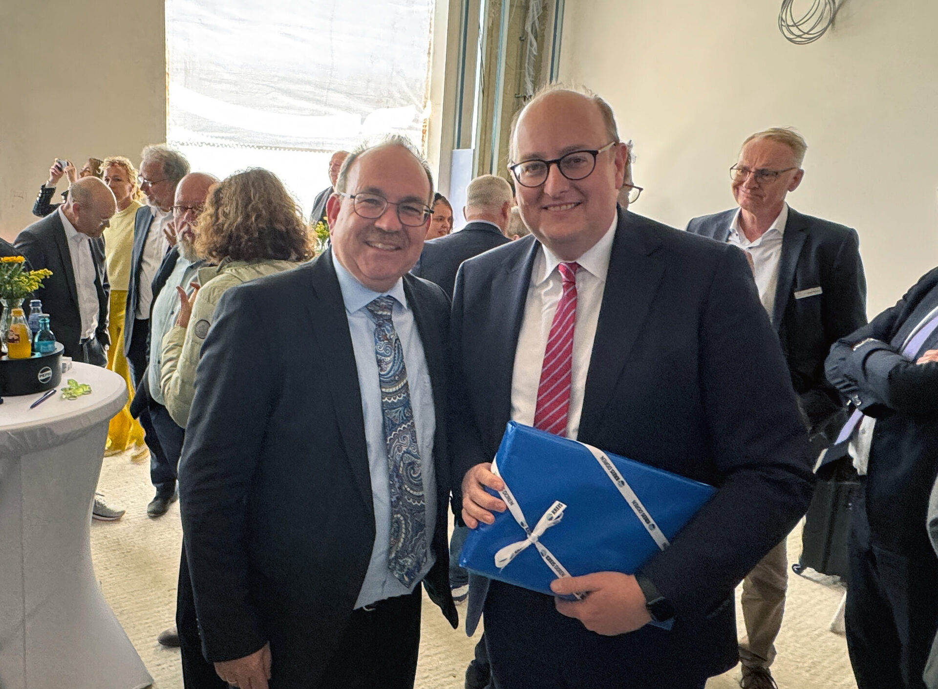Auch Matthias Hauer, Staatssekretär im Forschungsministerium in Berlin, betonte, dass die Modellfabrik ein wichtiges Zukunftsprojekt mit Beispielcharakter sei. Landrat Dr. Ralf Nolten überreichte ihm ein dem Anlass entsprechend ein Geschenk aus heimischer Papierproduktion.