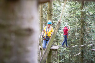 Höhenluft und Nervenkitzel bietet der Hochseilgarten in der Gemeinde Hürtgenwald. Hier lädt das Regionalforstamt Rureifel-Jülicher Börde von Wald und Holz NRW zu Spaziergängen durch die Baumkronen ein.