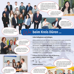 Der Kreis Düren mit seinen rund 1.400 Kolleginnen und Kollegen, die oftmals durch familiäre Beziehungen oder das Vereinsleben verbunden sind, pflegt eine Arbeitsatmosphäre wie bei einem Familienunternehmen. Hierzu trägt eine Vertrauenskultur bei, die geprägt ist von einer hierarchieübergreifenden Zusammenarbeit auf Augenhöhe und einer wertschätzenden Feedbackkultur, was insgesamt im Leitbild des Kreises Düren verankert ist.