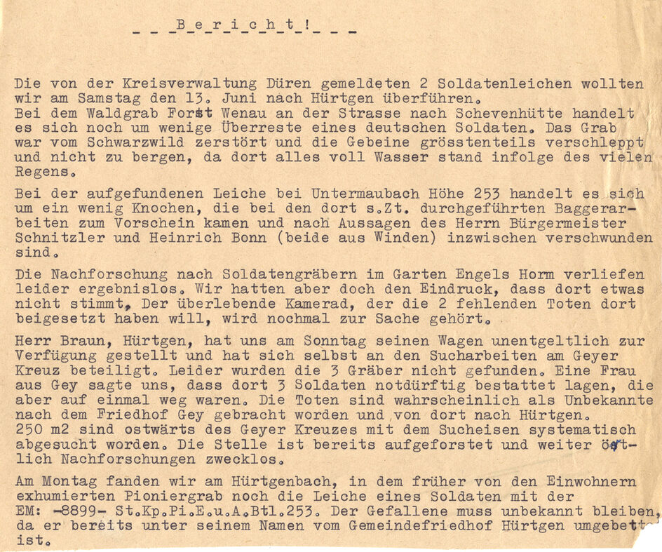 Die meisten dieser Gräber erwiesen sich als Provisorien. Denn die Errichtung der beiden großen Kriegsgräberstätten in Hürtgen und Vossenack ermöglichten es später, die sterblichen Überreste der Kriegstoten zentral zu bestatten. Das führte seit Ende der 1940er-Jahre zu zahlreichen Umbettungen. Der undatierte Bericht verdeutlicht die Schwierigkeiten, die sich bei der Auffindung und Identifizierung der Toten häufig ergaben.