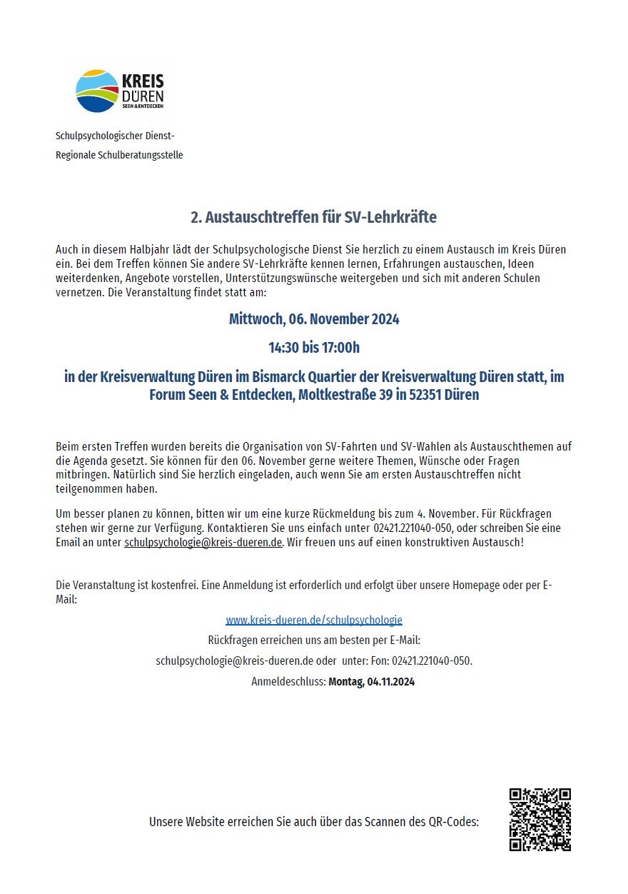 Hier geht es zur Anmeldung:zur Anmeldung für die Veranstaltung "Austauschtreffen für SV-Lehrkräfte" (Öffnet in einem neuen Tab)