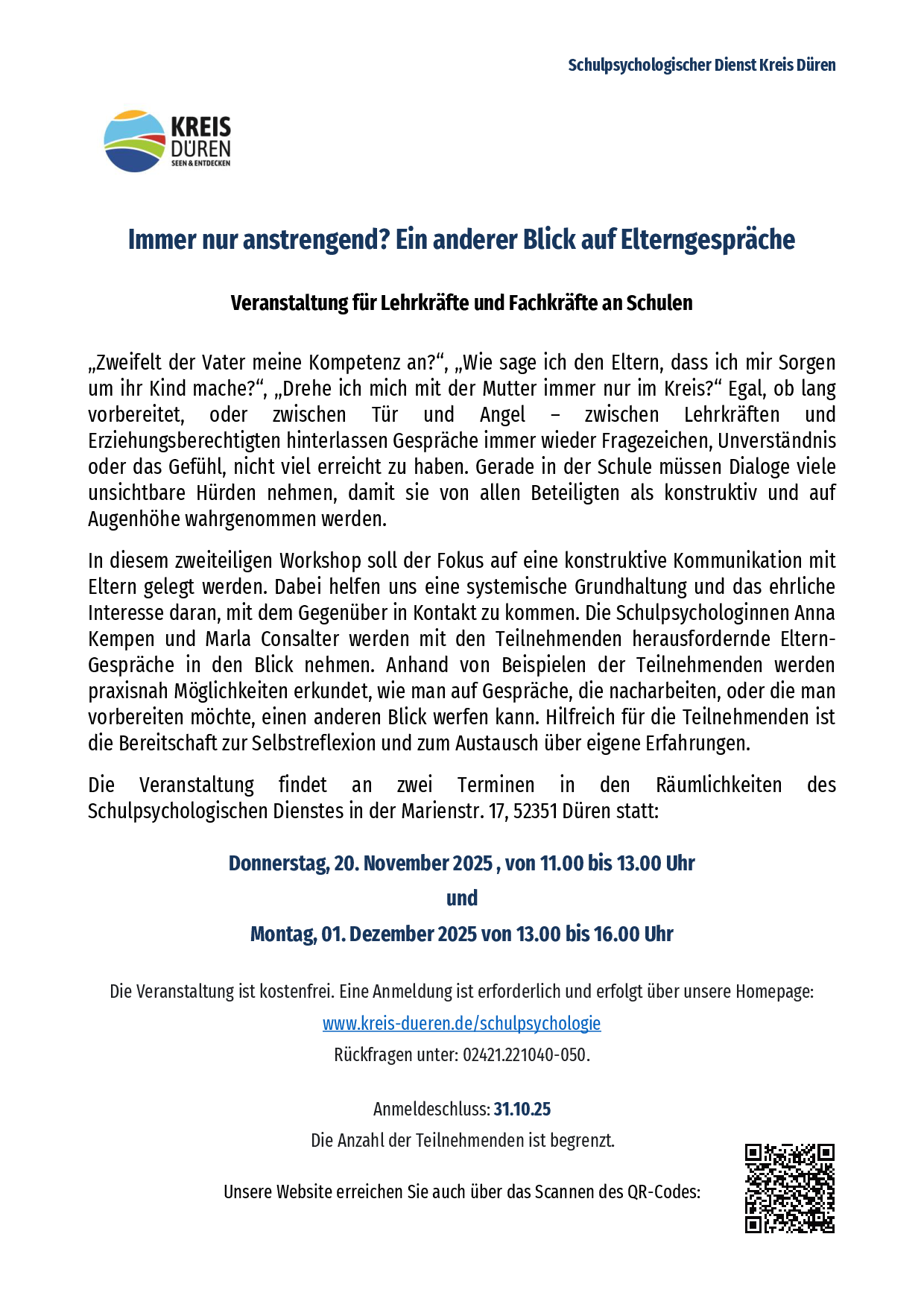 Hier geht es zur Anmeldung:zur Anmeldung "Immer nur anstrengend? Ein anderer Blick auf Elterngespräche" (Öffnet in einem neuen Tab)