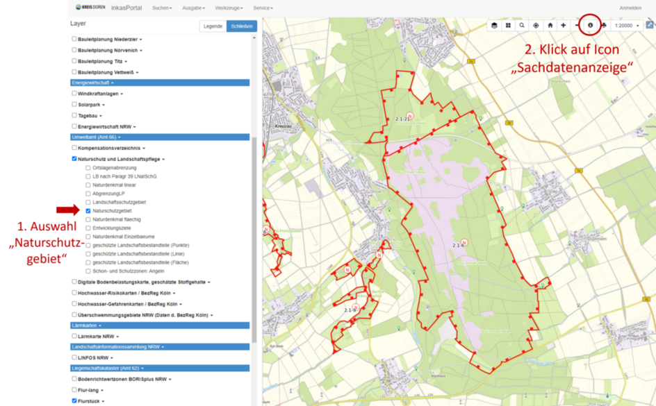 Mit Hilfe des Icons „Sachdatenanzeige" (i) können weitere Informationen zu den jeweiligen in der Karte zur Anzeige ausgewählten Layer (z.B. Naturschutzgebiete) abgerufen werden.