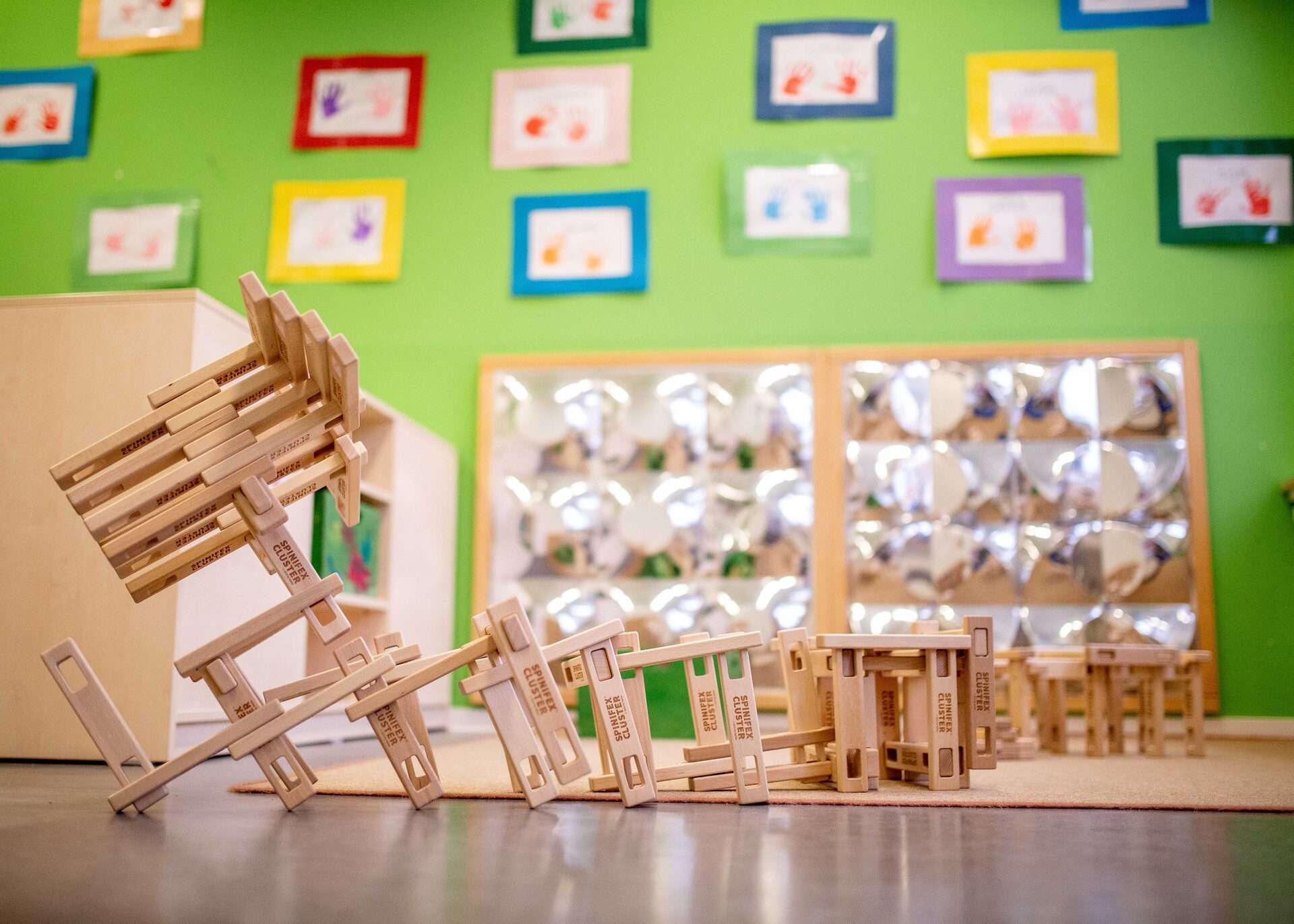 Eine bunte Auswahl an Konstruktionsmaterial, Gemeinschaftsspielen, Puzzeln und Büchern zur Beschäftigung wird allen Kindern im Freispiel angeboten.