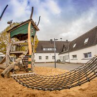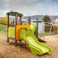 Die Einrichtung ist eingebettet in ein großzügiges Außengelände. In unserem großen Sandspielbereich steht eine Seilkletteranlage mit Rutsche, Hängematte und Türmen. Nicht nur für unsere Jüngsten leuchtet zusätzlich ein grünes Kletter- und Rutschspielgerät. Zum Schaukeln und Ruhen animiert eine Nestschaukel, die zum Schutz der Kinder durch ein Seil vom übrigen Spielbereich abgegrenzt ist.