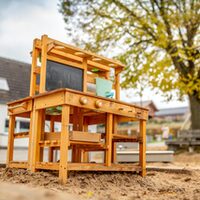Unsere Matschanlage mit Handpumpe ist an warmen Tagen der Magnet für alle Wasserliebhaber. Zum Schutz vor der Sonne spenden Bäume, Sträucher, Sonnensegel und Schirme ausreichend Schatten.