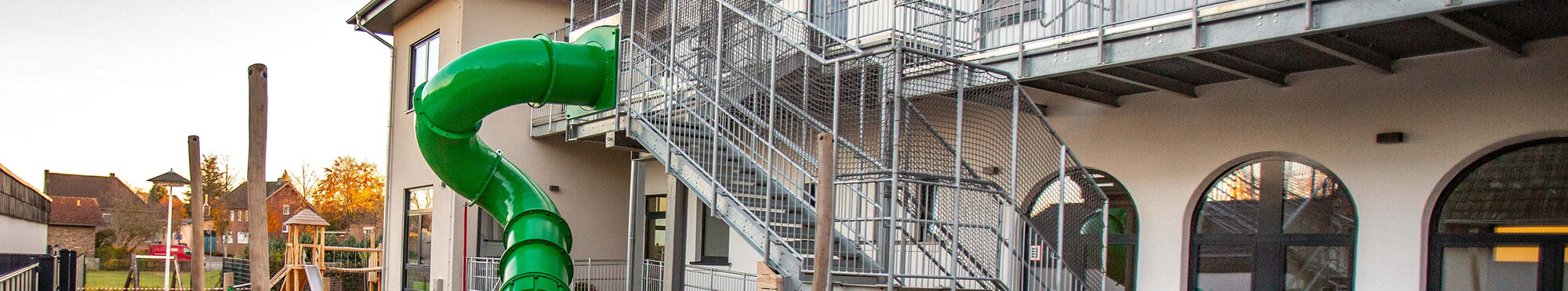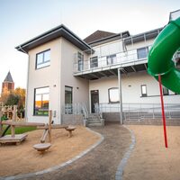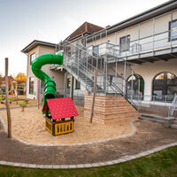 Unser Grundstück verfügt im vorderen Bereich der Einfahrt über Parkplätze für Eltern und Besucher. Das neu angelegte Außengelände erstreckt sich im hinteren und seitlichen Teil des Grundstückes. Jede Gruppe besitzt einen eigenen Zugang zum Außengelände. Die Bewegungs- und Spielelemente sind sowohl für U3- als auch für Ü3-Kinder geeignet und sind eine Mischung unterschiedlichster Bewegungsformen. Hierbei erhalten die Kinder die Gelegenheit, sich neue Fähigkeiten wie Klettern, Balancieren etc. anzueignen und das Bestehende zu fördern.