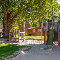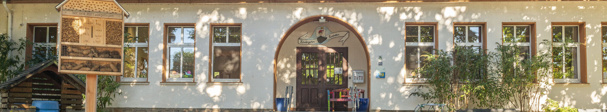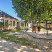 Die alten Baumbestände auf dem Außengelände bieten viele Möglichkeiten zum Spielen. Hier befinden sich ein Piratenschiff, eine Wassermatschanlage, eine Schaukel usw. Im Spielzeugholzhaus finden die Kinder eine Vielzahl von Sandspielzeugen sowie Bobbycars, Laufräder, Roller usw.