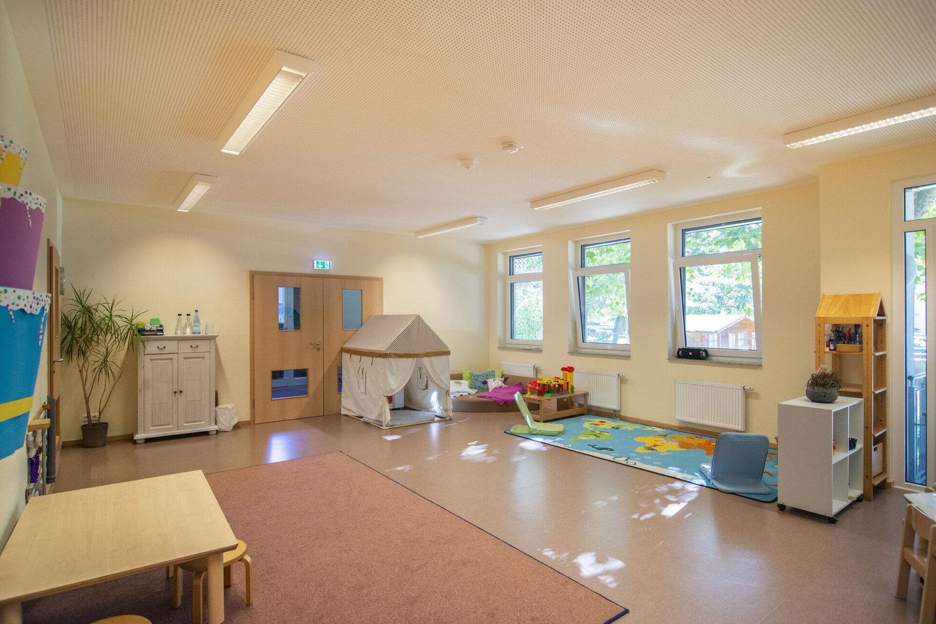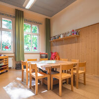 Jedes Kind lebt in der Geborgenheit seiner eigenen Gruppe und findet dort seine festen Bezugspersonen. Gleichzeitig ist es uns wichtig, den Kindern die Freiheit zu geben, sich während des „Freispiels“ alleine, nur mit einem Freund/einer Freundin, seinem Geschwisterchen oder in selbstgewählten Kleingruppen weiträumig zu verteilen und verschiedene Angebote in eigener Entscheidung in Anspruch zu nehmen. Die Räume werden als Funktionsräume gestaltet und in klare Bereiche aufgeteilt: in Erlebnis- und Bewegungsraum, Kreativwerk-statt/Forscherlabor, Sinnesraum, Rollenspielbereiche (wie Kaufladen, Familien-spiel, Friseur, Schule, Verkleiden), Leseecke, Baubereich und Kuschelecke. Die Mahlzeiten, wie gleitendes Frühstück und Mittagessen, werden im gemütlichen Kinderrestaurant eingenommen.