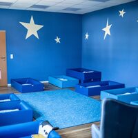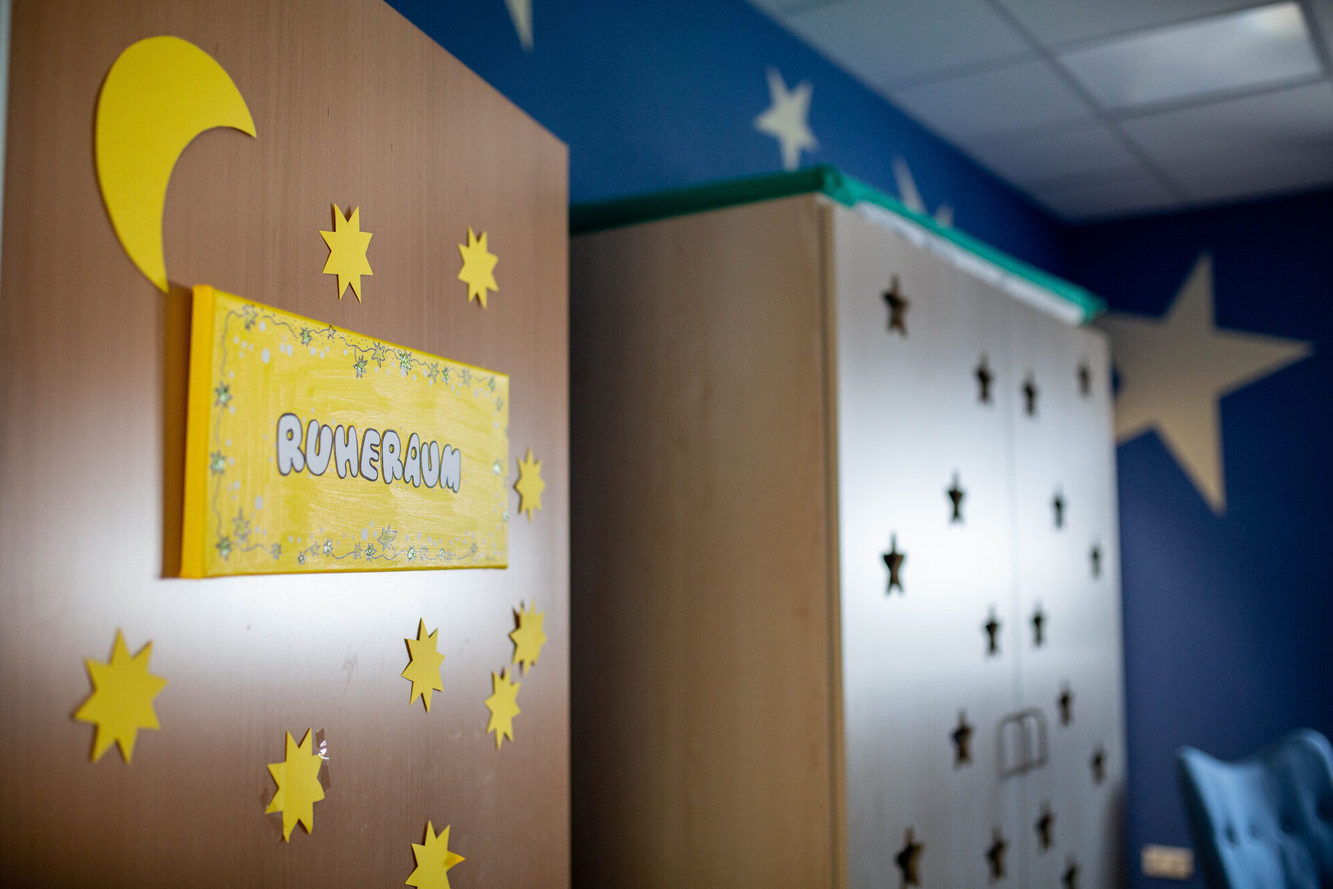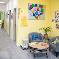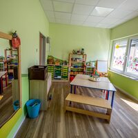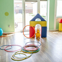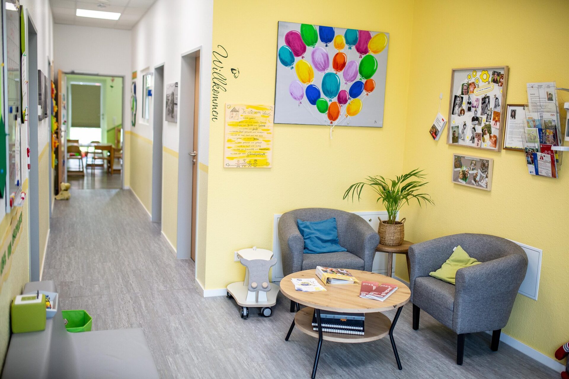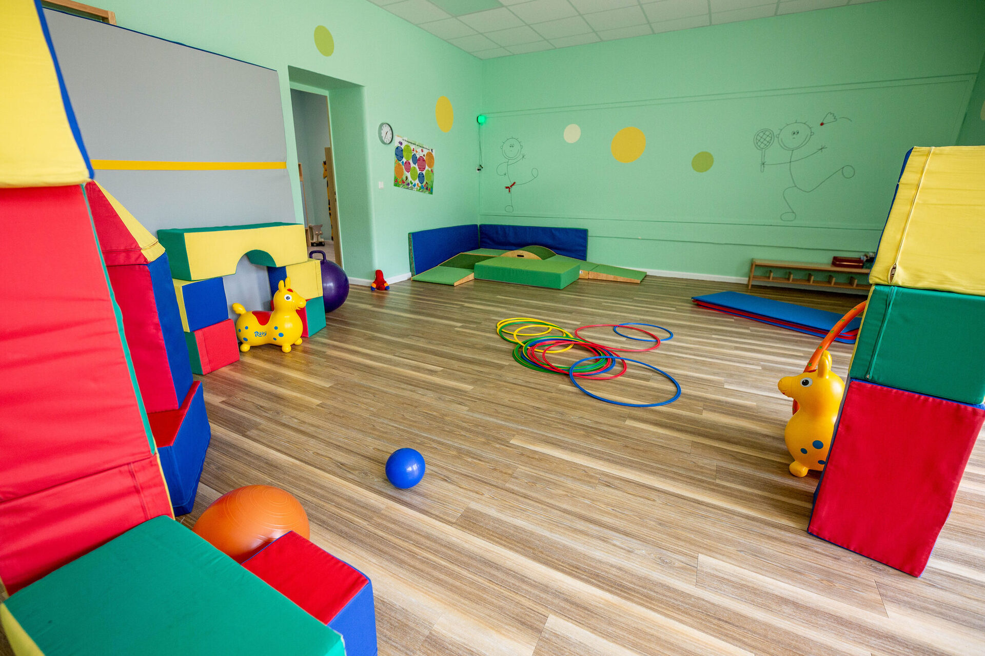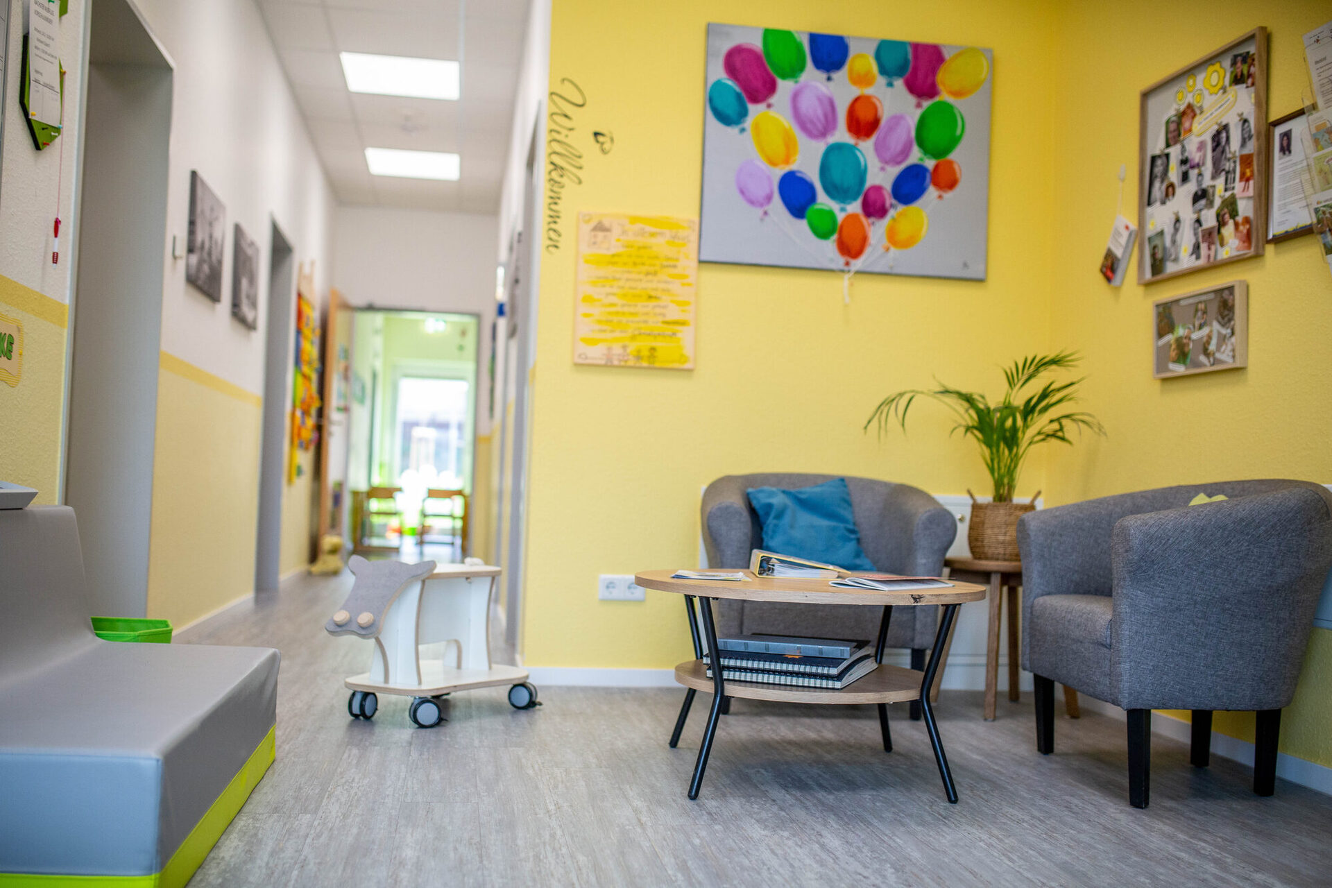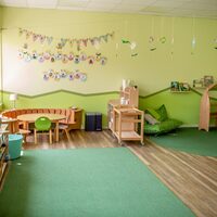 Unser Haus ist mit großen, freundlichen Räumen ausgestattet. Vom Eingangsbereich aus gelangt man in den Flur, der mit Garderoben für jedes Kind ausgestattet ist. Zwei große Gruppenräume mit jeweils einem Nebenraum laden kindgerecht zum Spielen ein. An den Flur angrenzend gelangt man sofort in zwei Kinderwaschräume, die mit zwei Kindertoiletten und Waschbecken ausgestattet sind. Auch der Wickelraum für die Kleinsten befindet sich in unmittelbarer Nähe und ist zusätzlich mit einer etwas kleineren Toilette, einem Waschbecken und einer Badewanne eingerichtet. Am Ende des Flures gelangt man durch eine Zwischentür in die Küche, die für viele zusätzliche Angebote genutzt wird.