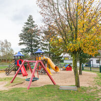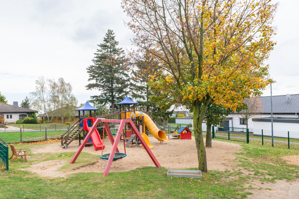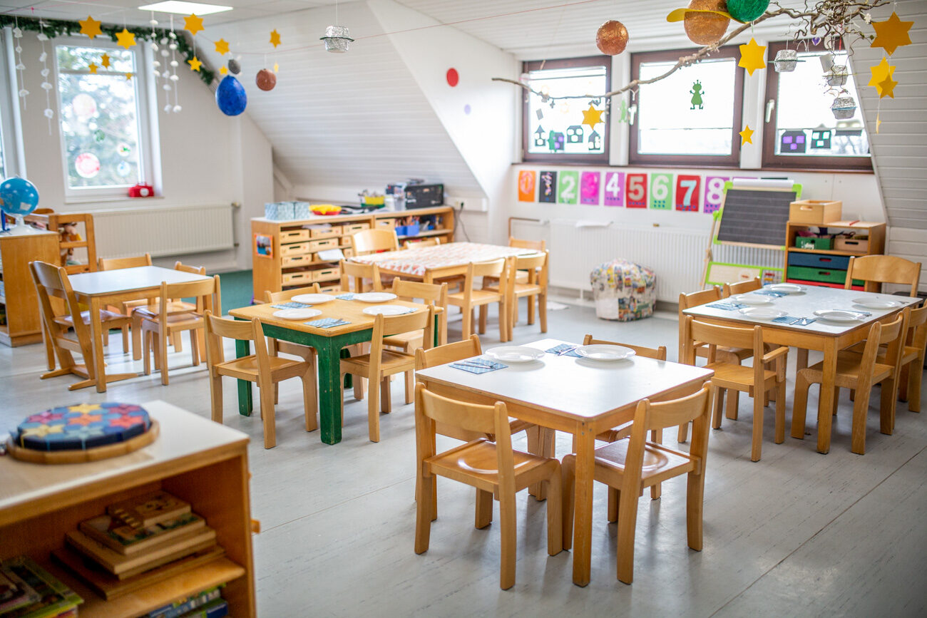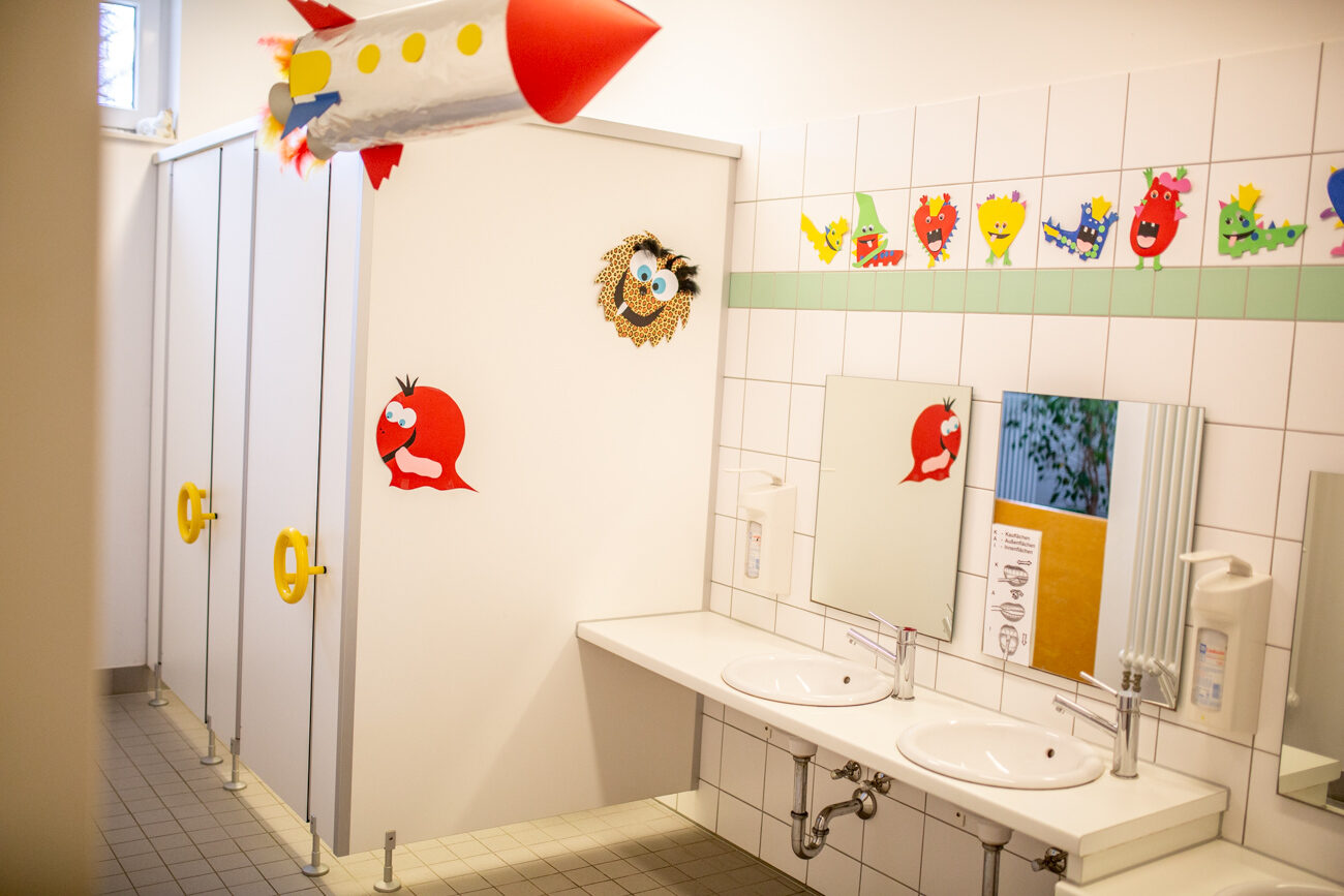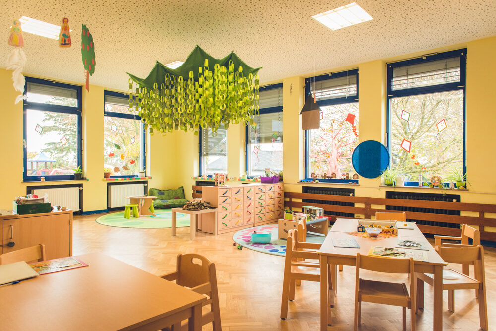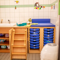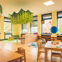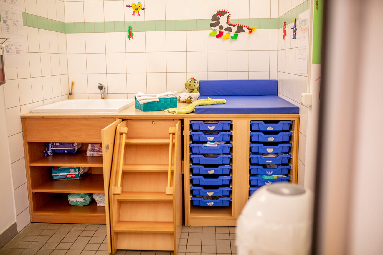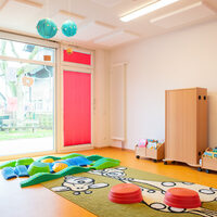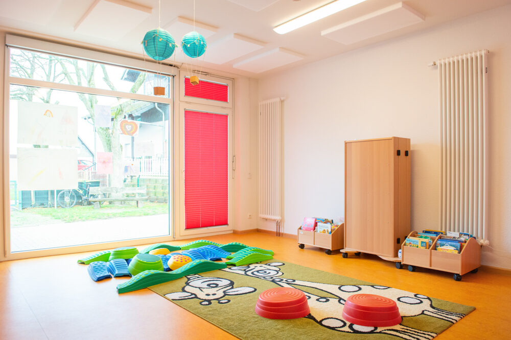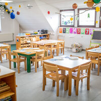 Durch einen Um- und Anbau können auch U3-Kinder aufgenommen werden. Die Tageseinrichtung erstreckt sich über ein Erd- und ein Obergeschoss. Im Erdgeschoss befinden sich zwei Gruppenräume. Jede Gruppe verfügt über einen Nebenraum sowie einen eigenen Waschraum. Der Wickelraum kann von beiden Gruppen genutzt werden. Die großzügige Eingangshalle dient beiden Gruppen als weiterer Spielraum.