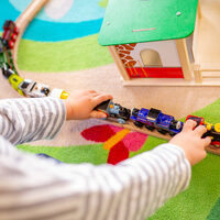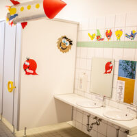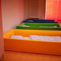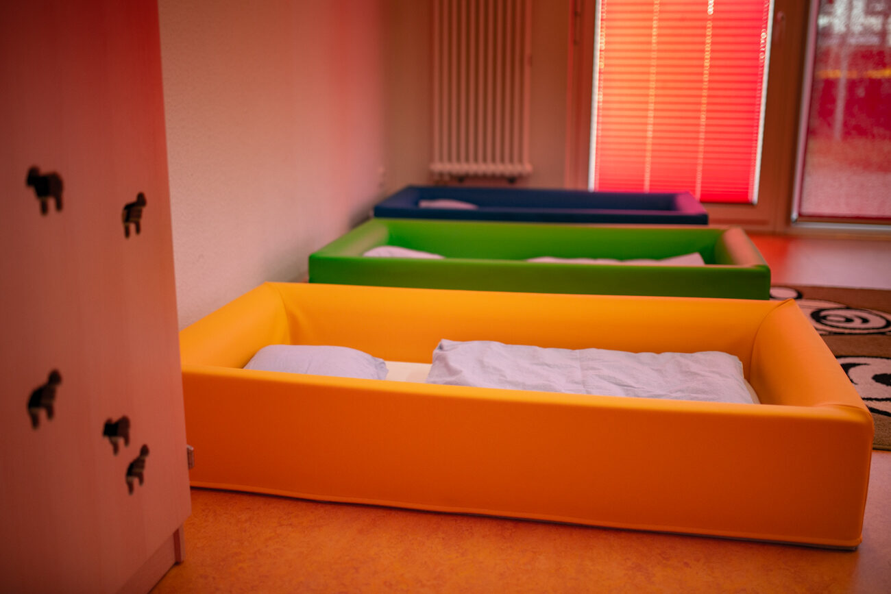 Im Obergeschoss befindet sich ein Mehrzweckraum, der für das gruppenübergreifende Turnen und die Vorschularbeit genutzt wird. Ein kleiner Flur dient als Kinderbücherei.