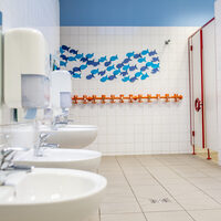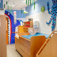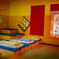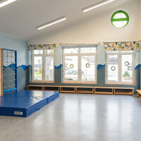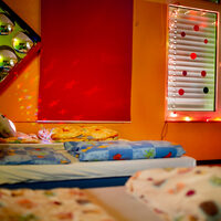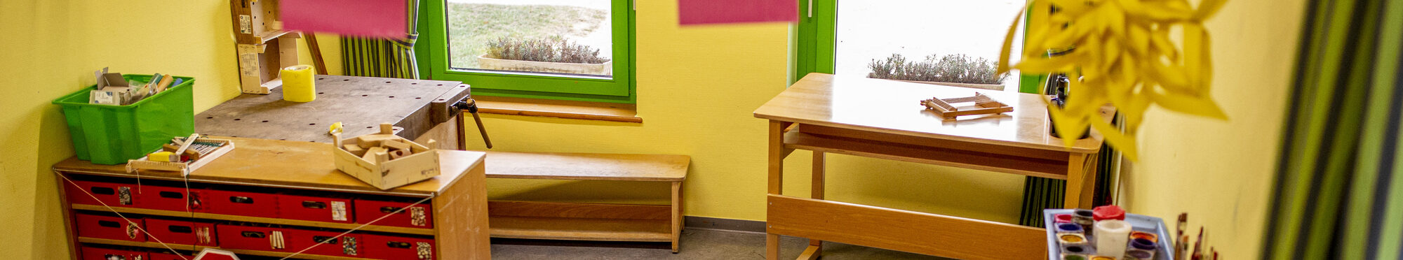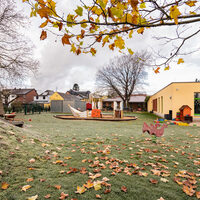 Unsere Kita liegt in einem kleinen, ländlichen Ort umgeben von Feldern und Wiesen mit verschiedenen Tieren ( Pferden, Schafen, Hühnern). Die Einrichtung ist ein moderner, farbenfroher Bau mit großen Fenstern und Bullaugen. Die Innengestaltung ist ebenfalls farbenfroh, sehr geräumig und einladend. Zu den vier Gruppenräumen gehören noch jeweils ein Nebenraum, ein Waschraum, Toiletten und ein Wickelraum. Die beiden großzügigen Eingangshallen dienen als Erlebnis- und Entdeckungshallen und laden zur Bewegung, Kommunikation und Kontaktaufnahme ein. Zudem verfügt unsere Einrichtung über einen Sprachraum und einen langen Flur, der als Bewegungsbaustelle dient und täglich genutzt werden kann. Weitere Räume sind eine große Turnhalle mit angrenzendem Materialraum , eine Küche mit zwei danebenliegenden Essräumen, ein Besprechungszimmer, ein Personalraum, ein Büro und verschiedene Räume zur Aufbewahrung von Spiel- und Bastelmaterialien und zwei Hauswirtschaftsräume.