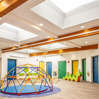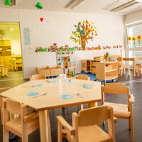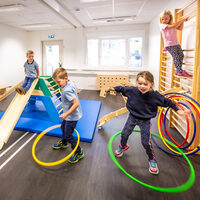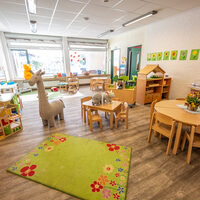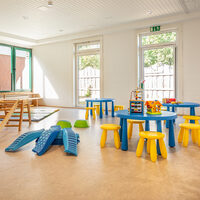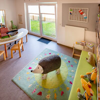 Unsere Kindertageseinrichtung liegt im ländlichem Ort Gey. Die Einrichtung zeichnet sich unter anderem durch die großzügigen, hellen und farbenfrohen Räumlichkeiten aus. Eine große Anzahl an Fenstern macht die Einrichtung hell, freundlich und gemütlich. Zusätzlich zu den Gruppenräumen verfügen 3 Gruppen über je 2 Nebenräume, einem separaten Wickelraum und einem Waschraum. 1 Gruppe hat einen Nebenraum und einen Waschraum, der Wickelraum befindet sich angegliedert in unserer großzügigen Kletterhalle. Im Eingangsbereich befinden sich Therapieräume, Büros und ein der Küche angegliederter großer Speisesaal. Dieser wird auch für andere Aktionen genutzt. Weiterhin gibt es einen Bewegungsraum und mehrere Abstellräume. Gemütlich eingerichtete Nischen dienen als Ruhezonen. Unser Eltern Café hat einen eigenen Raum und kann täglich genutzt werden.