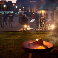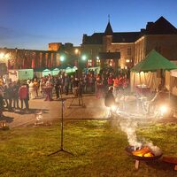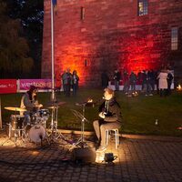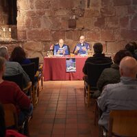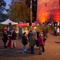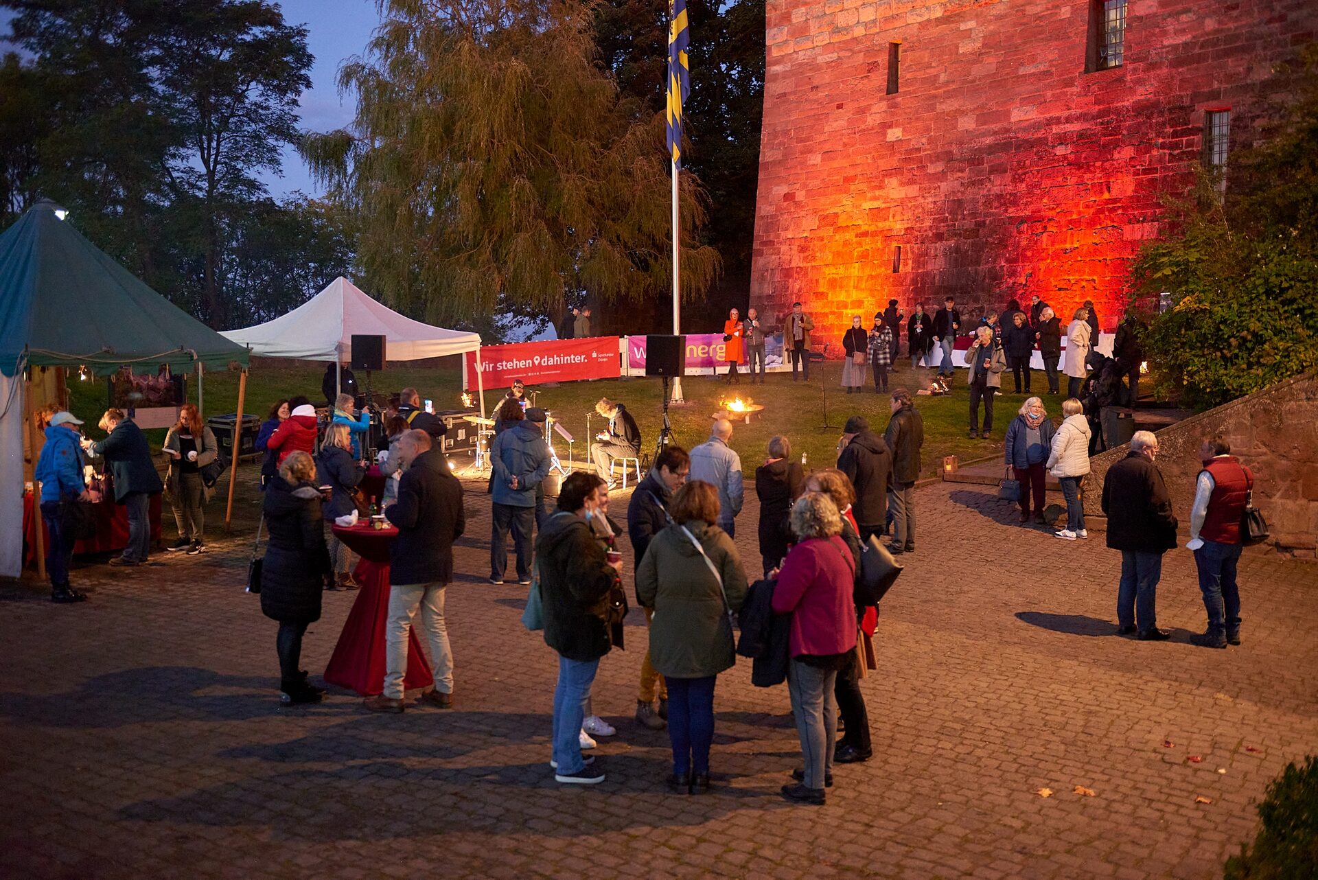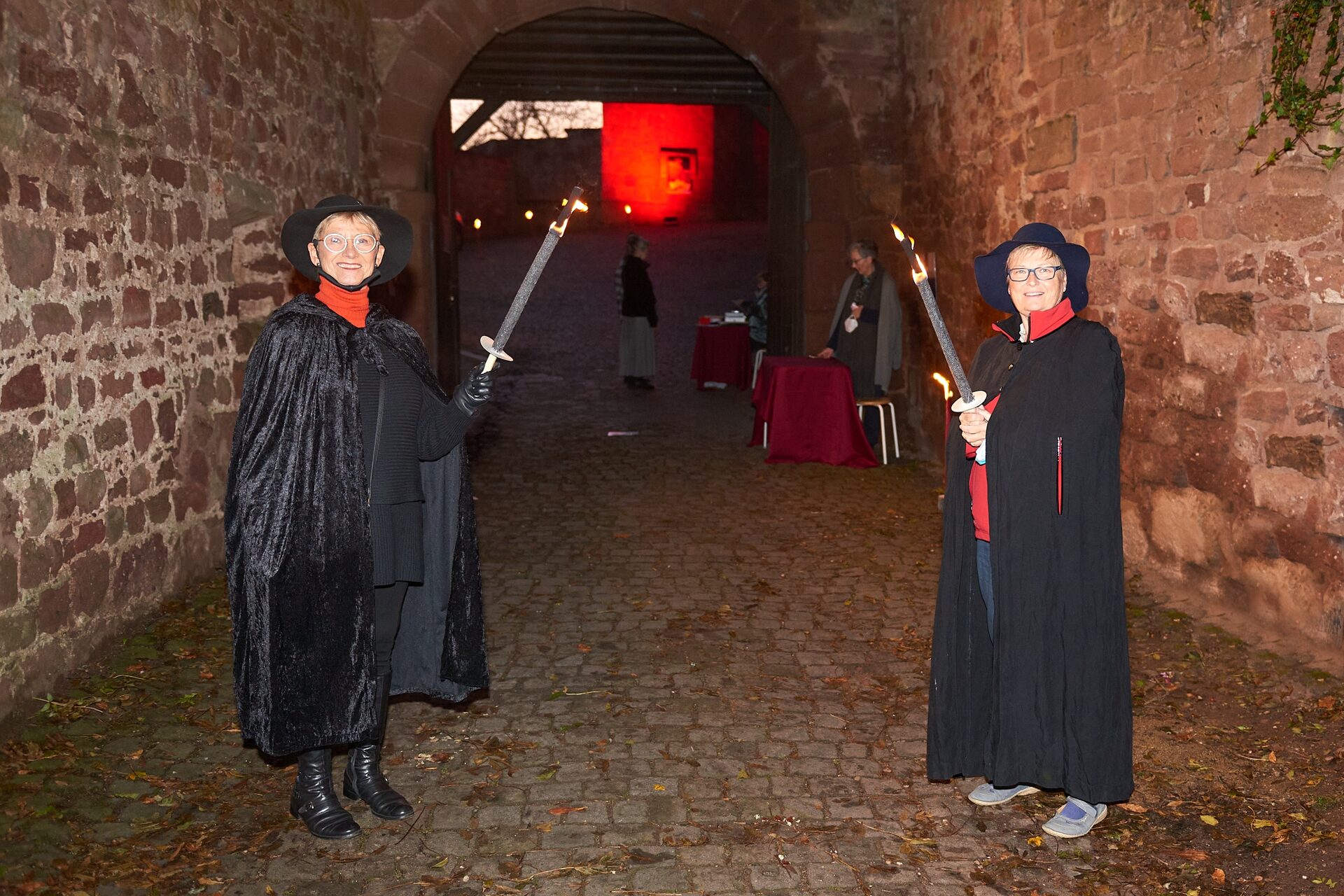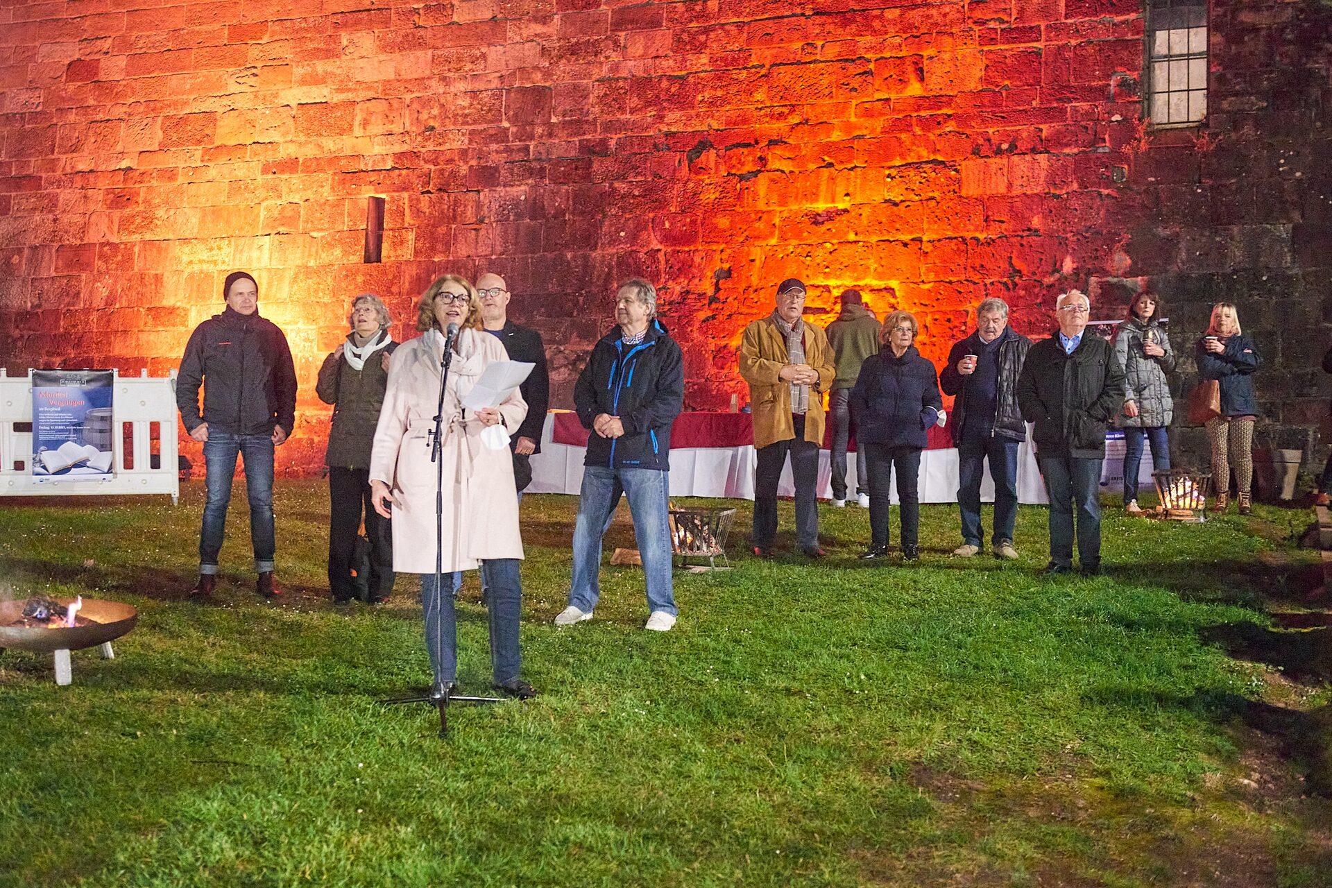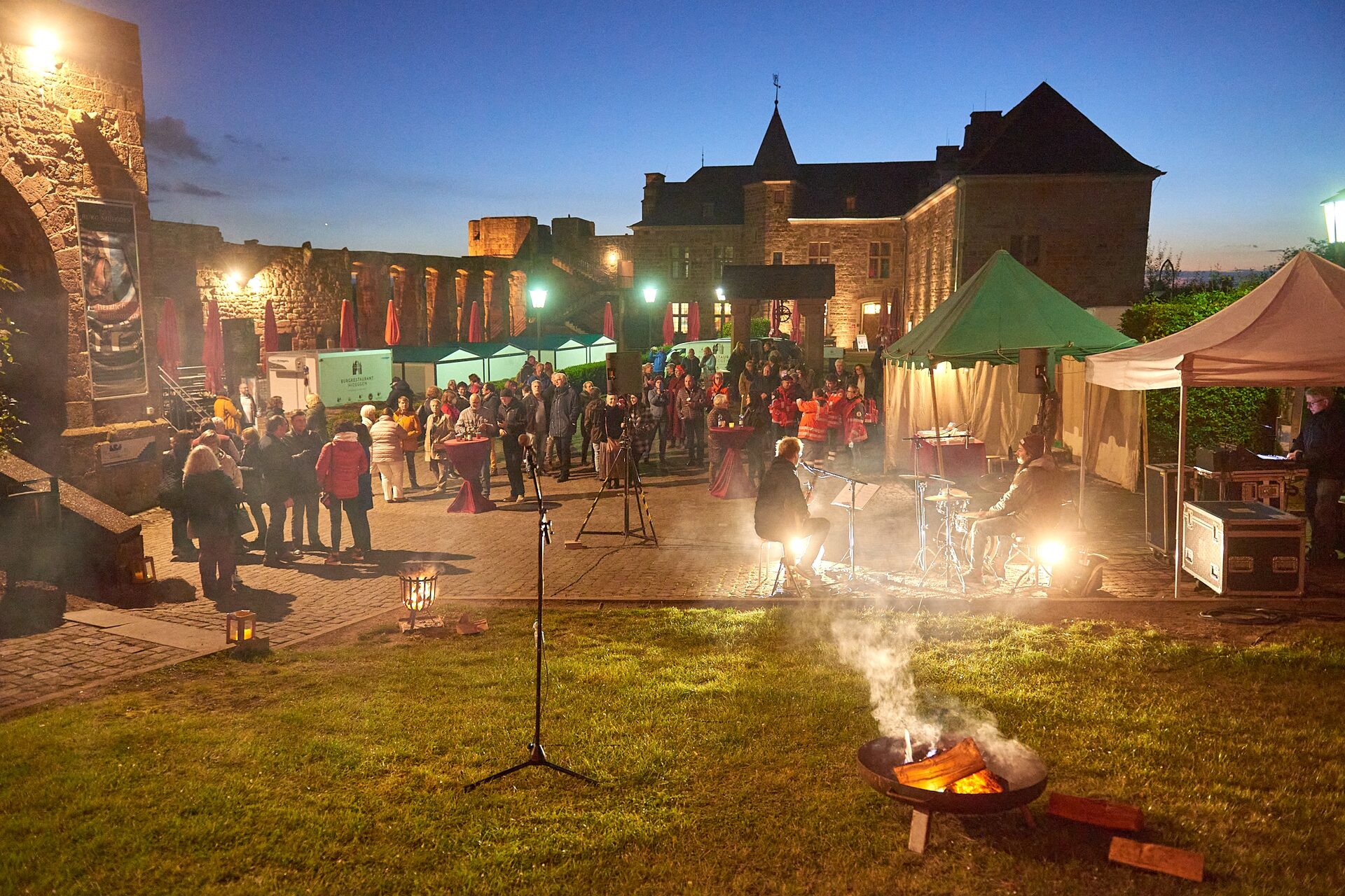 Ab 19 Uhr konnten die gespannten Besucher die Burganlage über einen mit Fackeln gesäumten Weg betreten. Im Burghof erwarteten die Gäste Lagerfeuer, ein stimmungsvolles musikalisches Duo unter der Leitung von Bernhard Gerards, eine Outdoor-Bar mit Getränken und Snacks sowie ein gut bestückter Büchertisch der Buchhandlung Lesezeichen aus Kreuzau. Nachdem alle Krimifans in „ihre“ Gruppe eingeteilt worden waren, konnte es mit dem Mord(s)vergnügen los gehen. Die vier namhaften Autoren Ulrike Bliefert, Eva Maaser und das Autorenduo Uwe Wilhelm und Martin Lutz hatten je eine halbe Stunde, das Publikum in ihrem jeweils ganz eigenen Bann ihrer Bücher zu ziehen. Jede Gruppe besuchte jede Autorenlesung.