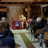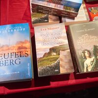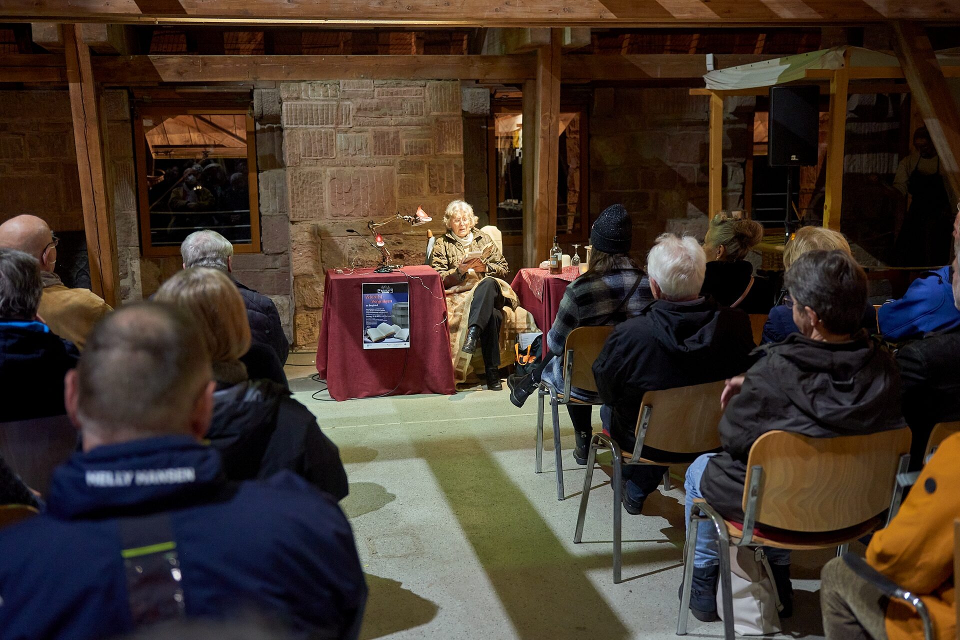 Im Dachgeschoss des Bergfriedes hatte es sich Eva Maaser mit ihrem Roman „Tod unter Whisky Freunden“ gemütlich gemacht. Der ein oder andere Schluck aus der Whiskyflasche half der studierten Germanistin und Kunsthistorikerin dabei. Erst am Ende bei der Autogrammrunde verriet sie, was für ein Getränk in Wirklichkeit in der Wiskyflasche war. Ihrem Publikum heizte heißer Tee und vor allem die spannend vorgetragene Kostprobe ihres Krimis ein.