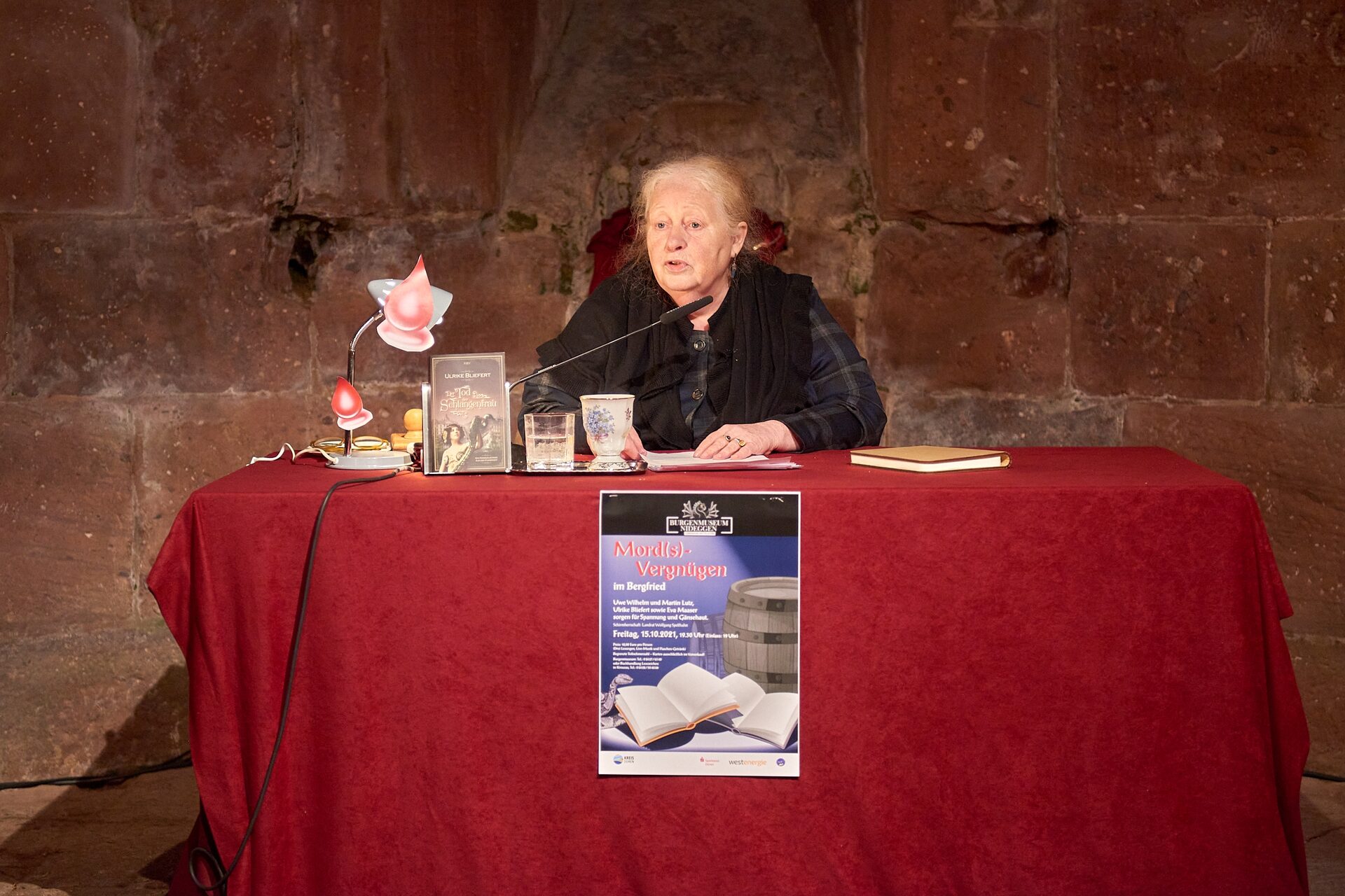 In der stimmungsvollen Burgkapelle der Burg Nideggen, direkt neben dem Kerker, konnten die Krimi-Fans schließlich der mit zahlreichen Dialekten gespickten Stimme von Schauspielern und Autorin Ulrike Bliefert lauschen. Mit ihrem Kriminalroman „Der Tod der Schlangenfrau“ entführte sie das begeisterte Publikum in das Berlin des 20. Jahrhunderts. Bei ihrem Eintreffen im Bergfried sagte die Schauspielerin, dass sie aus Pandemie-Gründen eine Anfrage für einen Tatort-Dreh abgesagt hätte, aber als ihre Agentin ihr von der Anfrage zum "MordsVergnügen" berichtete, stand ihre Zusage sofort fest. Das Ambiente dieser Veranstaltung wollte sie nicht verpassen. Ulrike Bliefert war zum zweiten Mal dabei. Vor zwei Jahren hatte sie aus: "Die Samariterin" gelesen.