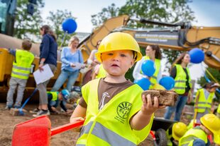 Sie begingen den offiziellen Baubeginn "Am Wassergarten". Ab Herbst 2022 sollen auf dem rund 1100 Quadratmeter großen Gelände rund 90 Kinder im Alter von eins bis sechs spielen und toben können. Der zweigeschossige Festbau wird die derzeitige mobile Einrichtung in Modulbauweise ersetzen, in der zurzeit 77 Kinder betreut werden. Die neue Einrichtung überzeugt also nicht nur durch einen festen Standort, sondern auch mehr Kitaplätze, um dem wachsenden Bedarf in der Gemeinde gerecht zu werden. Im August 2018 wurde zunächst eine dreigruppige Kita im Provisorium eröffnet, 2020 wurde diese durch eine Gruppe erweitert. Die fünfte Gruppe folgte Januar 2021.