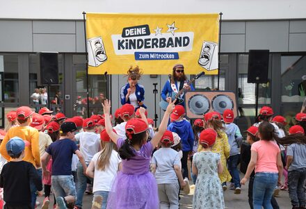 Seit mehr als zehn Jahren steht das Duo auf der Bühne und schreibt und spielt als "Deine Kinderband" eigene, rockige Songs für Kinder und Familien. Gefördert werden sie vom NRW-Ministerium für Kultur und Wissenschaft. Bei ihrem Auftritt auf dem Außengelände des Familienzentrums spielten sie rund eine Stunde lang Lieder zum Mitsingen, Mitrocken und vor allem Mitbewegen.