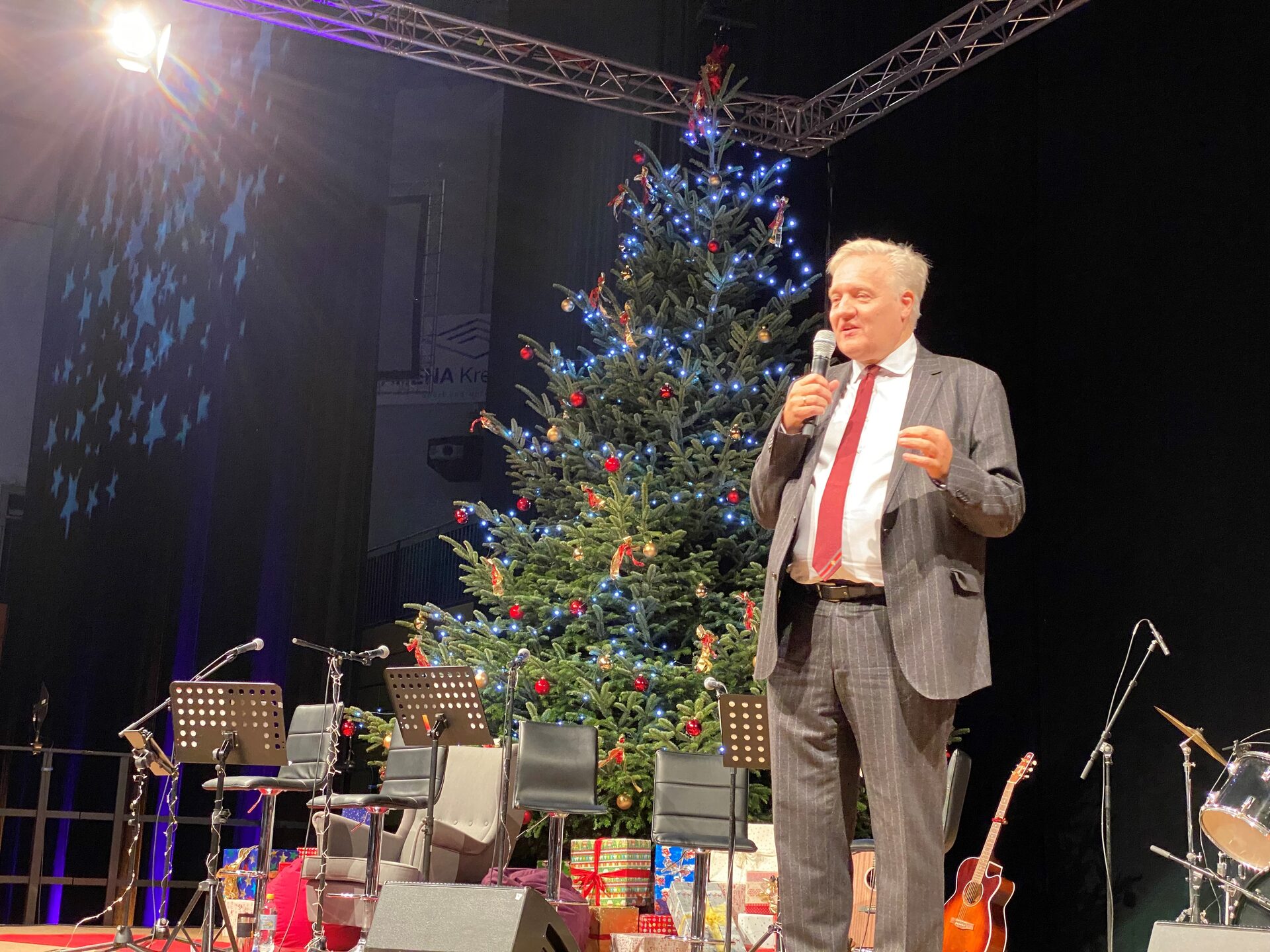 "Nach diesem ereignisreichen und schweren Jahr wollen wir gemeinsam diese feierliche Auszeit genießen. Ich freue mich, dass wir nach der zweijährigen Coronapause heute wieder hier zusammengekommen sind", sagte Landrat Wolfgang Spelthahn, bevor die Musikwerkstatt "Improfissimo" auftrat. Die jungen Musikerinnen und Musiker begeisterten das Publikum mit stimmungsvollen Liedern und animierten alle zum Mitsingen der klassischen Weihnachtslieder. Aber nicht nur Weihnachtslieder wurden an dem Nachmittag zum Besten gegeben, denn die Abba-Tribute-Band "Take a Chance on us" sorgte mit den größten Hits der schwedischen Band für Stimmung. Auch der Nikolaus ließ es sich zuvor nicht nehmen, dem Publikum einen Besuch abzustatten und gemeinsam zu singen und Geschichten zu erzählen. Unterstützt wurde er dabei von den jungen Tänzerinnen der TF Company Düren. Die Kinder zeigten ihr Talent auf der Bühne und zauberten ein Lachen auf die Gesichter im Publikum. Durchs Programm führte Christian Mourad. Unterstützt wurde die Veranstaltung von der Sparkasse Düren.