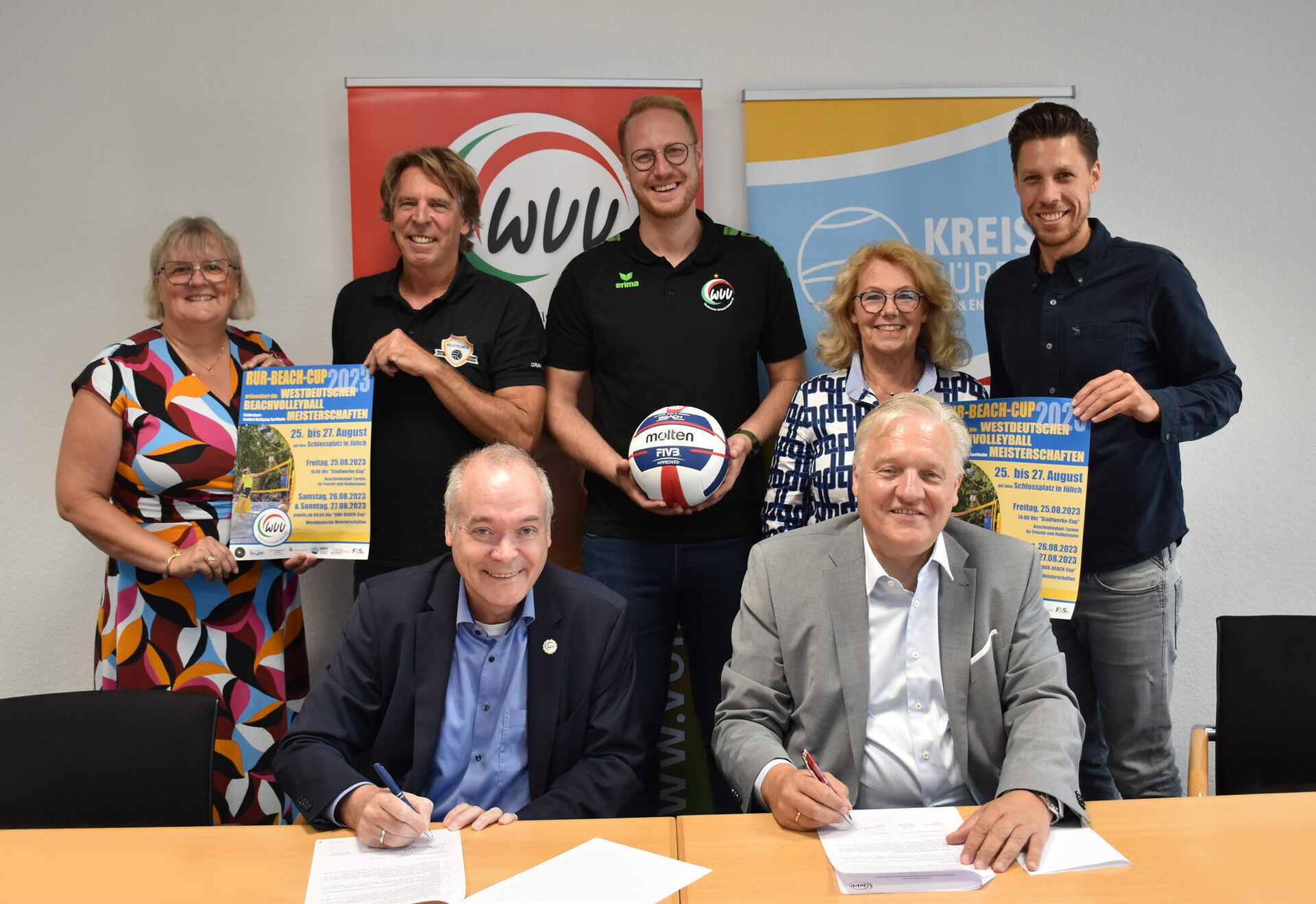 Am Samstag und Sonntag, 26. und 27. August, kämpfen auf dem Schlossplatz in Jülich wieder die besten Damen- und Herren-Teams um die Siegerpokale des Westdeutschen Volleyball-Verbandes (WVV). "Ich freue mich auf spannende Spiele und das hochkarätige Turnier, das eine sportliche Aufwertung des Kreises Düren repräsentiert. Wir wollen ein guter Gastgeber für alle Athletinnen und Athleten sein", sagt Landrat Wolfgang Spelthahn bei der feierlichen Unterzeichnung des Ausrichtungsvertrages. Auch WVV-Präsident, Hubert Martens, freut sich auf den Cup: "Es ist eine Ehre, mit dem Kreis Düren einen so vertrauensvollen Partner an der Seite zu haben. Am wichtigsten ist, dass sich die Spielerinnen und Spieler wohlfühlen – das ist auf dem Schlossplatz in Jülich definitiv möglich." Landrat Wolfgang Spelthahn drückt – nicht nur den Sportlerinnen und Sportlern – die Daumen: "Beachvolleyball lebt von den äußeren Rahmenbedingungen. Wir bemühen uns, die Regenwolken fernzuhalten und hoffen auf strahlenden Sonnenschein."