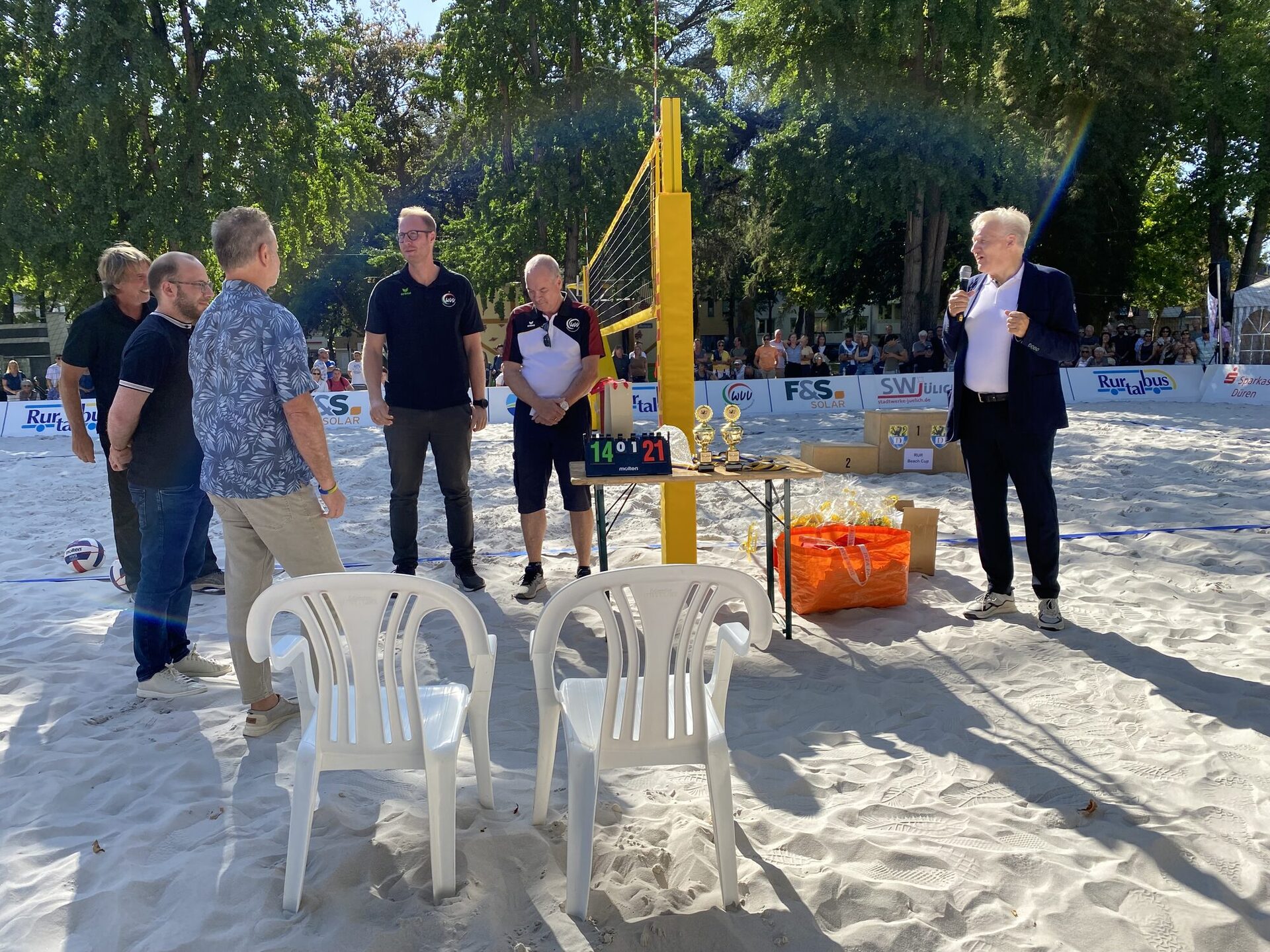 Für den Rur-Beach-Cup werden rund 460 Tonnen Quarz-Sand aufgeschüttet, die danach dem Jülicher Brückenkopfpark gespendet werden. An allen Tagen sind Zuschauerinnen und Zuschauer bei freiem Eintritt herzlich zum Anfeuern und Mitfiebern eingeladen. Sie können sich am Sonntag, 27. August, zudem über ein Highlight der SWD Powervolleys Düren freuen. Der neue Geschäftsführer Tomáš Kocian-Falkenbach (neben Benjamin Kaulen) stellt das Team der nächsten Saison vor und Personen aus dem Publikum können Gewinne absahnen. Der Rur-Beach-Cup 2023 findet dank der Unterstützung der Rurtalbus GmbH, indeland GmbH, Sparkasse Düren, Stadtwerke Jülich, des Kreissportbundes Düren e.V. und des Unternehmens F&S Solar statt.