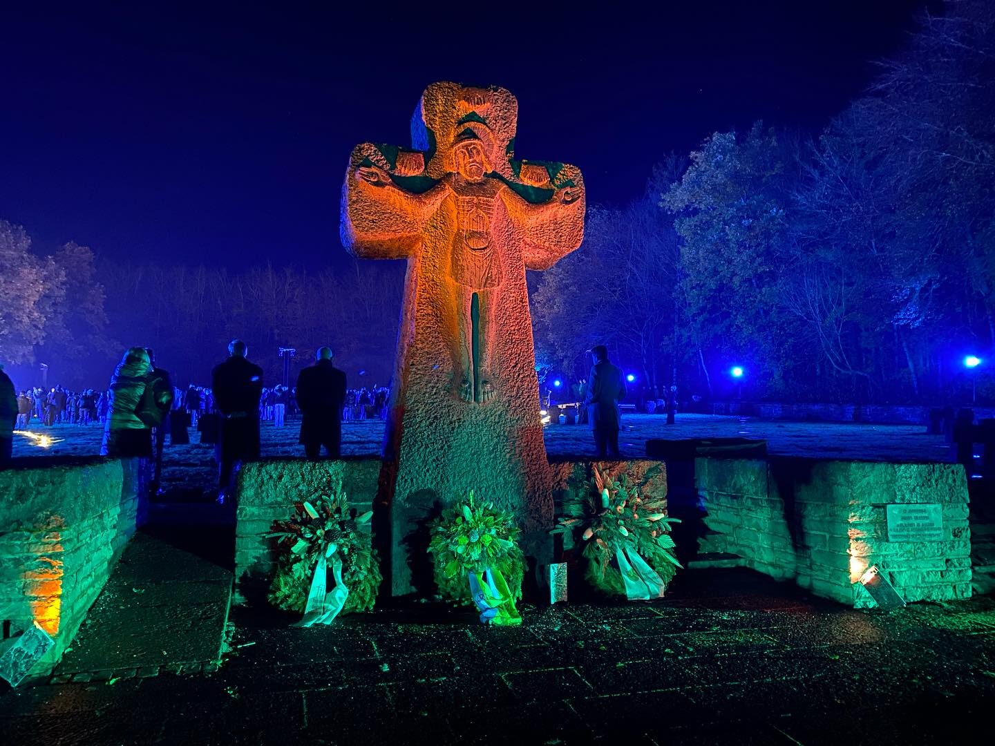 Nach der Aufführung in der Kirche begaben sich alle gemeinsam zu der Kriegsgräberstätte Vossenack. Dort gedachten Landrat Wolfgang Spelthahn, Peter Kaptain, allgemeiner Vertreter des Landrates, und Stephan Cranen, Bürgermeister der Gemeinde Hürtgenwald, an den Kränzen der Kriegsopfer. Die Vorstellung der 40 Darstellerinnen und Darsteller im Alter von 14 bis 75 Jahren wurde fortgeführt. Spätestens bei dem abschließenden Lied „Gib‘ dem Frieden ein Gesicht“ hatten wohl einige Anwesende eine Gänsehaut – und das nicht aufgrund der kalten Temperaturen. Zum Schluss zündeten alle Besucherinnen und Besucher gemeinschaftlich ein Friedensfeuer an.