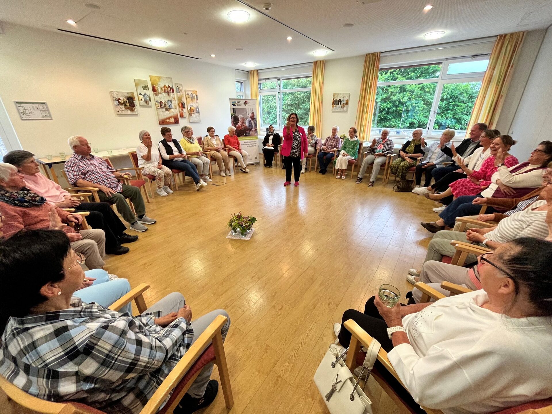In Vossenack gelingt das schon sehr gut. „Es gibt einen Stamm an Personen, aber es kommen auch immer wieder neue hinzu, was uns sehr freut”, sagt Julia Richter von der Koordinationsstelle. Die Treffen können natürlich nur stattfinden, wenn es auch geeignete Räumlichkeiten gibt. In Vossenack stellt die das Seniorenzentrum Geschwister-Louis-Haus zur Verfügung. „Vom Haus erhalten wir den Raum, das Geschirr und die Lebensmittel. Dafür zahlt jede Teilnehmerin und jeder Teilnehmer einen Beitrag von fünf Euro, um die Kosten zu decken. Ohne die Unterstützung wäre dies sonst nicht möglich”, sagt Monika Sandjon. Konrad Dobbelstein leitet die Einrichtung und schaut auch regelmäßig selbst bei den Treffen vorbei – so wie diesmal beim Lachyoga. „Wir unterstützen die Treffen gerne. Viele Menschen aus dem Ort nutzen das Angebot und kommen immer wieder hierher”, sagt er. Und weil es so gut angenommen wird, soll es ausgebaut werden. „Wir möchten die Treffen noch mehr im ländlichen Raum etablieren, daher suchen wir Kooperierende, die mit unserer Unterstützung eigenständige Treffen aufbauen”, sagt Carolin Küpper.