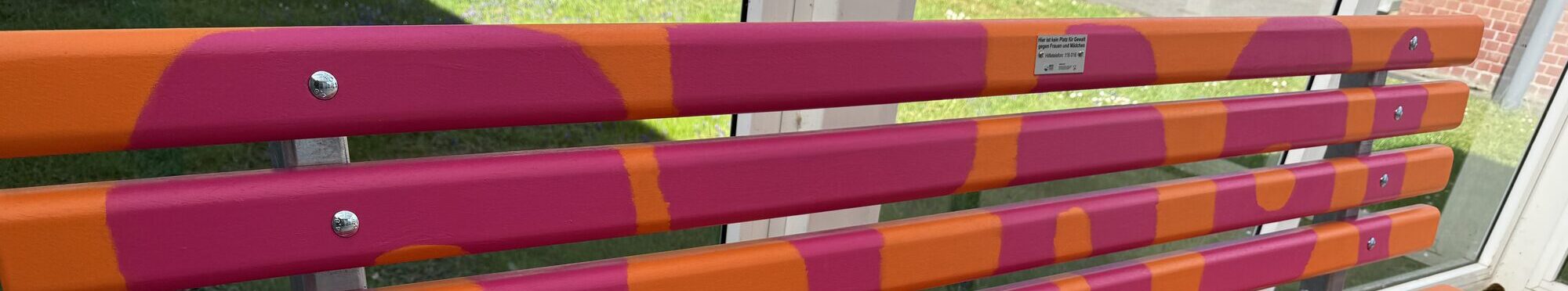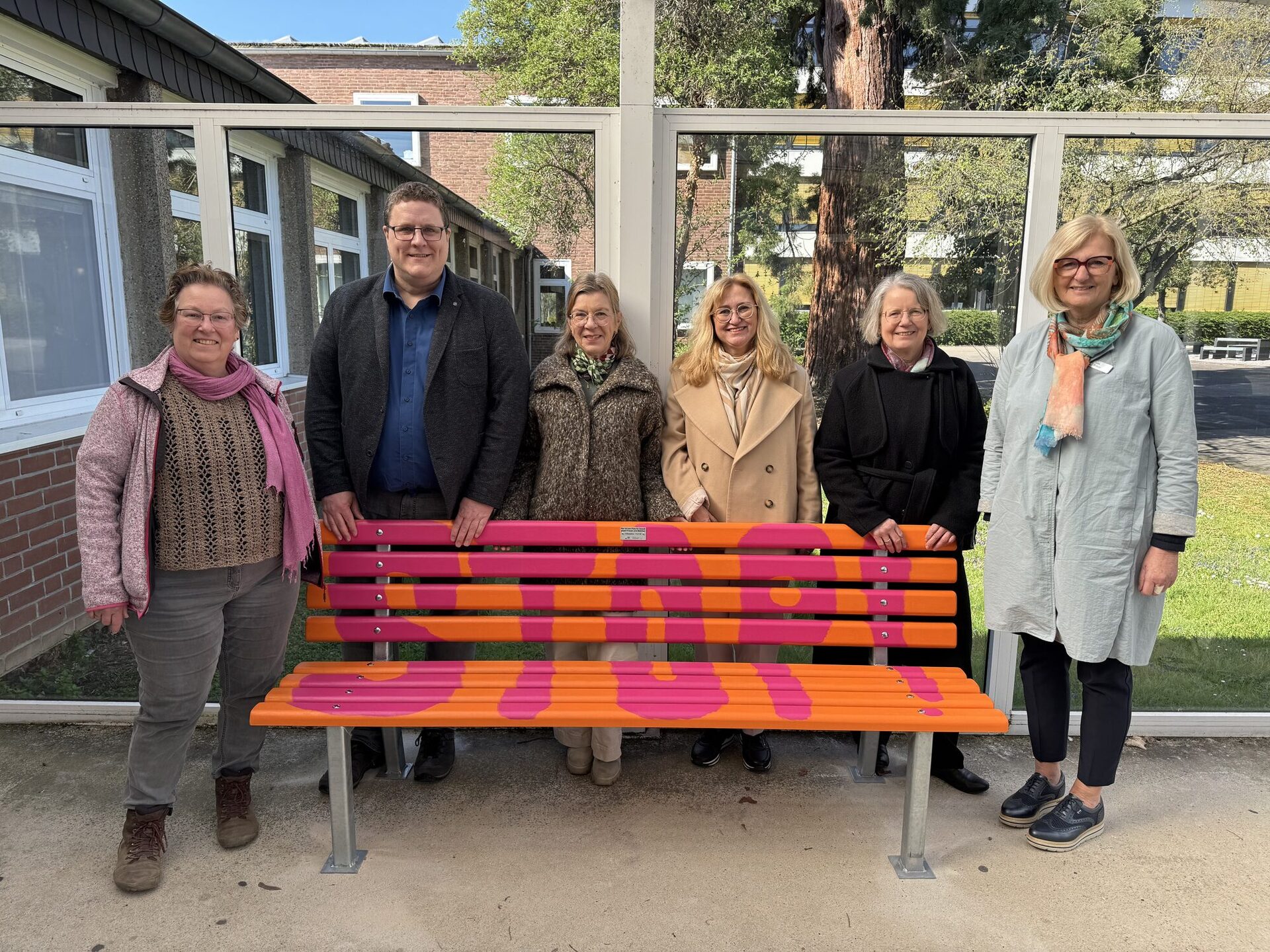 Die Schulleitungen der beiden Berufskollegs, Kerstin Rutwalt-Berger (Nelly-Pütz-Berufskolleg) und Hagen Hußmann (Berufskolleg für Technik) betonen, wie sehr sie sich freuen, dass der Schulhof als Ort für die Bank auserwählt wurde. Nach diesem Beispiel gibt es bereits viele Bänke in ganz Deutschland und zwei weitere in Jülich und Linnich. Orange als Signalfarbe ist immer mit dabei. Die Bank wurde von den Rurtalwerkstätten in Düren gebaut und von Frauen bemalt. Das Ministerium für Kinder, Jugend, Familie, Gleichstellung, Flucht und Integration des Landes NRW hat das Projekt finanziell gefördert.
