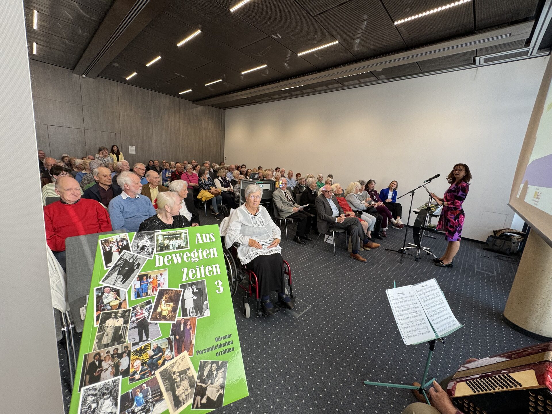 Initiatorin Ingrid Nothhelfer bedankte sich bei allen, die dazu beigetragen haben, das Buch zu realisieren. Sie las aus einigen Geschichten derjenigen vor, die an dem Nachmittag leider nicht anwesend sein konnten. Sie ist eine der zahlreichen „SeniorTrainerinnen und SeniorTrainer“, die im Rahmen des Projekts EFI (Erfahrungswissen für Initiativen) ausgebildet wurden. Ziel ist es, dass Menschen ihr Erfahrungswissen ehrenamtlich in die Gesellschaft einbringen und mit ihren Mitmenschen teilen. Dieses Engagement zeigte sich einmal mehr an dem Nachmittag der Lesung. Musikalisch begleitet wurde die Veranstaltung von Max Roeder auf dem Akkordeon.
