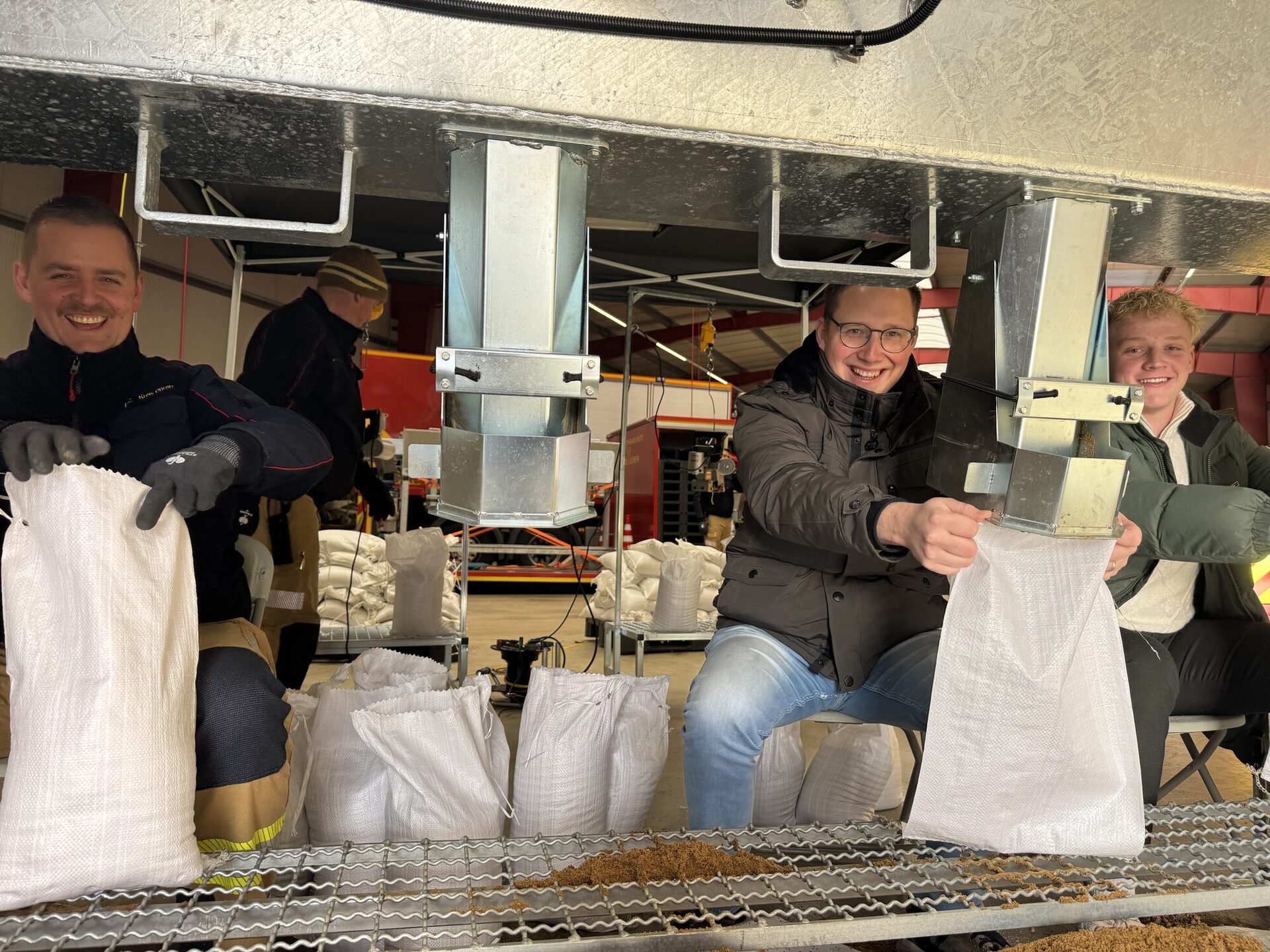 Die Maschine ist mobil und in etwa 30 Minuten aufgebaut, ein Generator versorgt sie mit Strom, damit der Sand rüttelnd verteilt werden kann, die Nähmaschinen zum Verschließen funktionieren und die Einsatzkräfte Licht haben. Zwei Maschinen hat der Kreis am FTZ stehen. Wir sind gut vorbereitet. Die Starkregenereignisse und Einsätze haben in den vergangenen Jahren leider zugenommen, sodass auch die Sandsack-Abfüllmaschine sicherlich in Zukunft häufiger zum Einsatz kommen muss”, sagt Karlheinz Eismar.