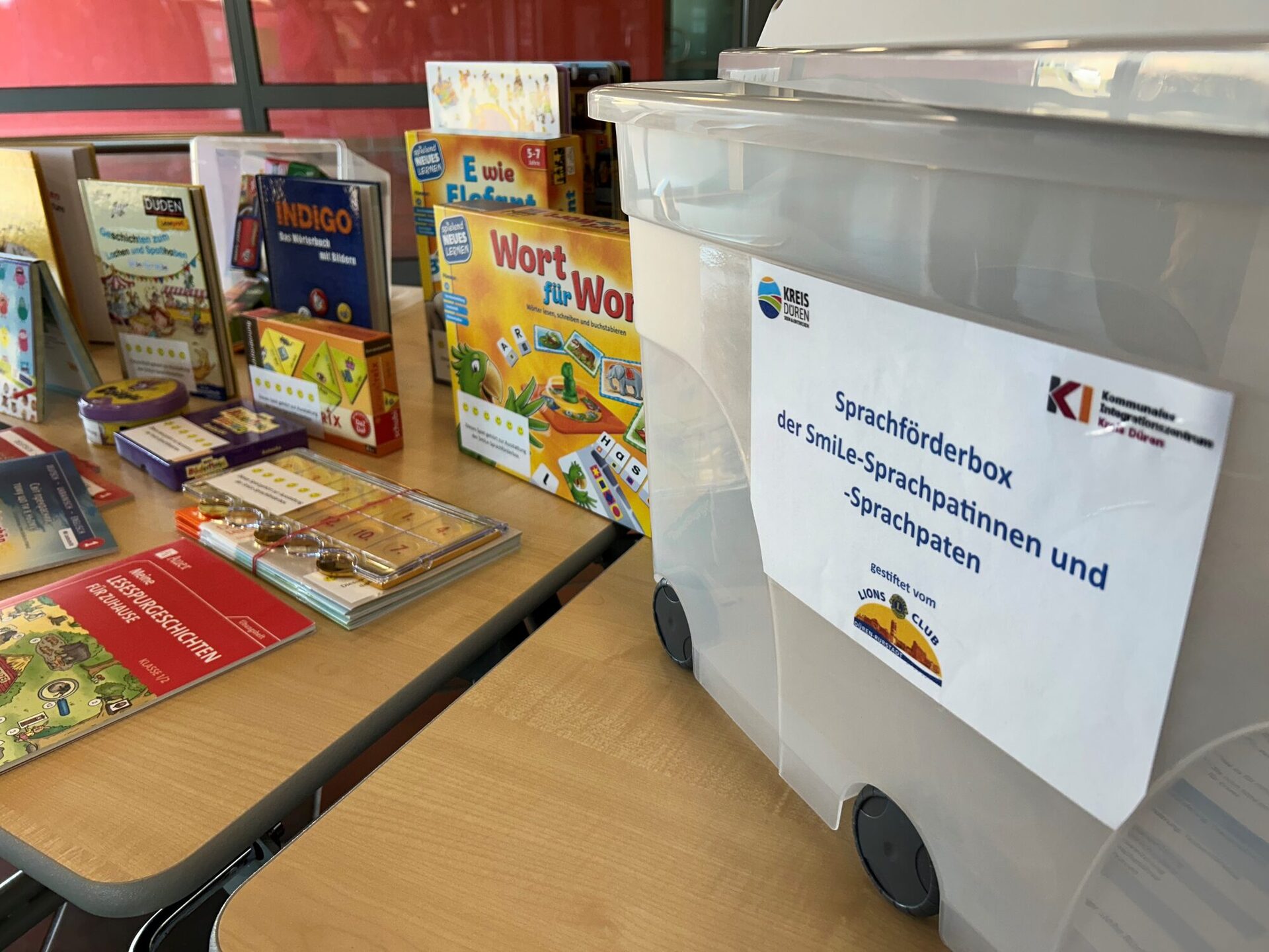 Das ehrenamtliche Sprachpaten-Projekt „SmiLe“ des Kreises Düren wird durch den Lions-Club Düren-Rurstadt mit acht Sprachboxen für Grundschulen weiter unterstützt. Die Sprachboxen enthalten verschiedene Materialien wie Bücher und Spiele, mit denen die deutsche Sprache einfach und niedrigschwellig vermittelt werden kann.