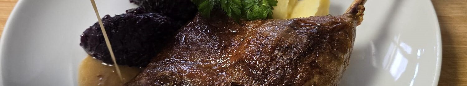 Das Gemüse mit dem Rotwein ablöschen und diesen komplett reduzieren. Die Keulen nun wieder in den Bräter legen. Den Bräter mit Gänsebrühe oder Gemüsebrühe auffüllen, sodass die Gänsekeulen etwa 3 cm mit Wasser bedeckt sind.